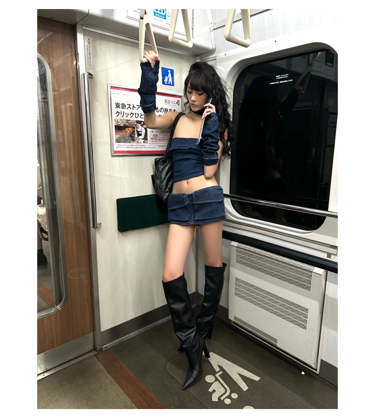 KYLETHOMASW - American Retro Denim Strapless Backless Y2k Crop Top Low-waisted Cargo Shorts Streetwear 3 Piece Sets Womens Outifits
