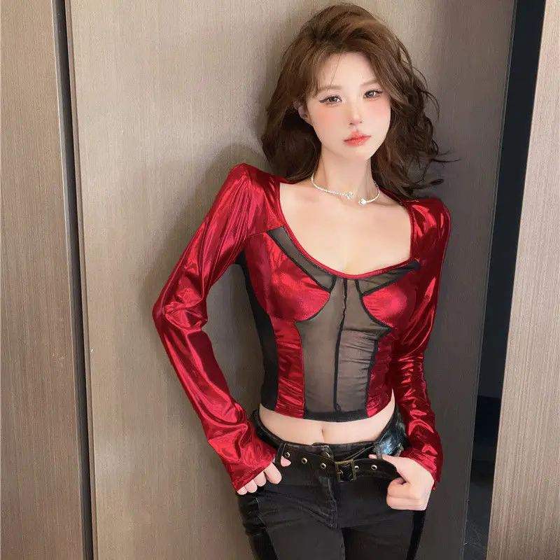 KYLETHOMASW  -  Autumn Long-Sleeved T-Shirt New U-Neck Women Autumn Sexy Mesh Bottoming Shirt Slim Short Top Women Silver Short T-Shirt
