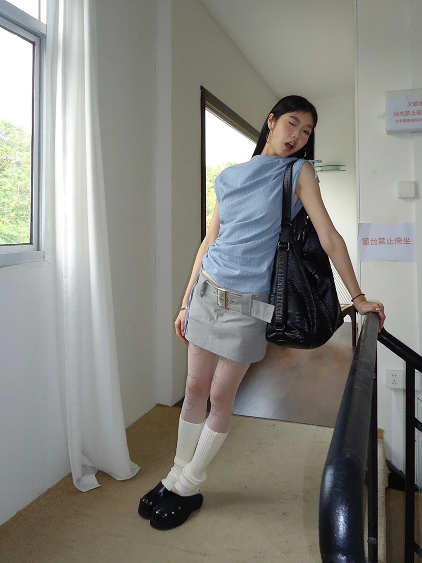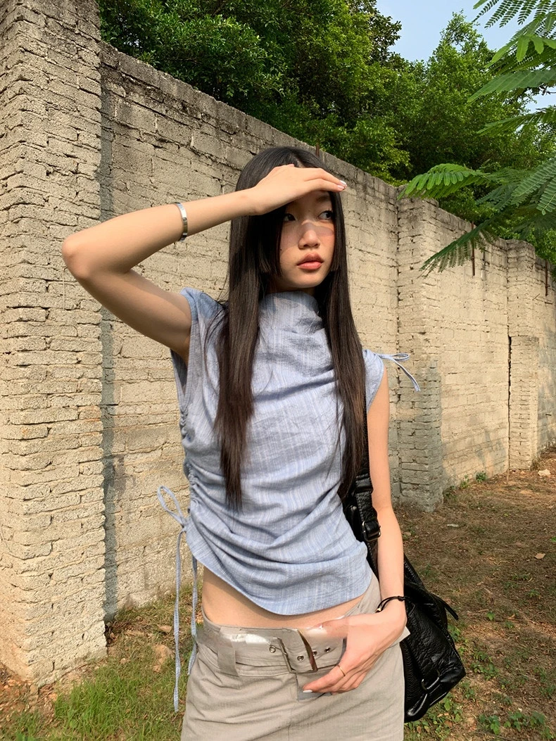 Kylethomasw Blue Sleeveless Tank Tops Women Striped Irregular T-shirts for girl Drawstring Lace Up High Neck Tees Hip Hop Streetwear