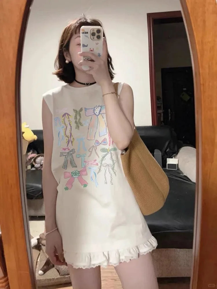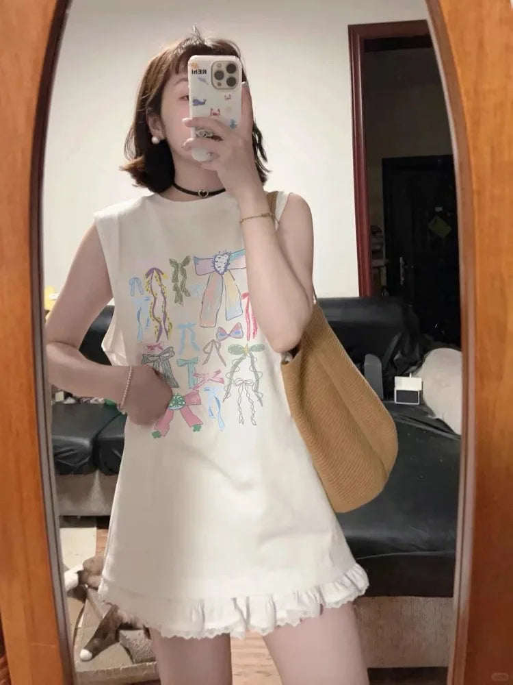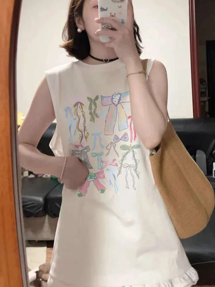 Kylethomasw Bow Print Tank Tops Kawaii Sleeveless Oversize T-shirts Women 100% Cotton Y2k Summer Korean Fashion Cutecore Clothing