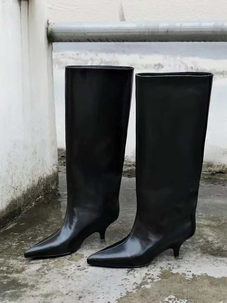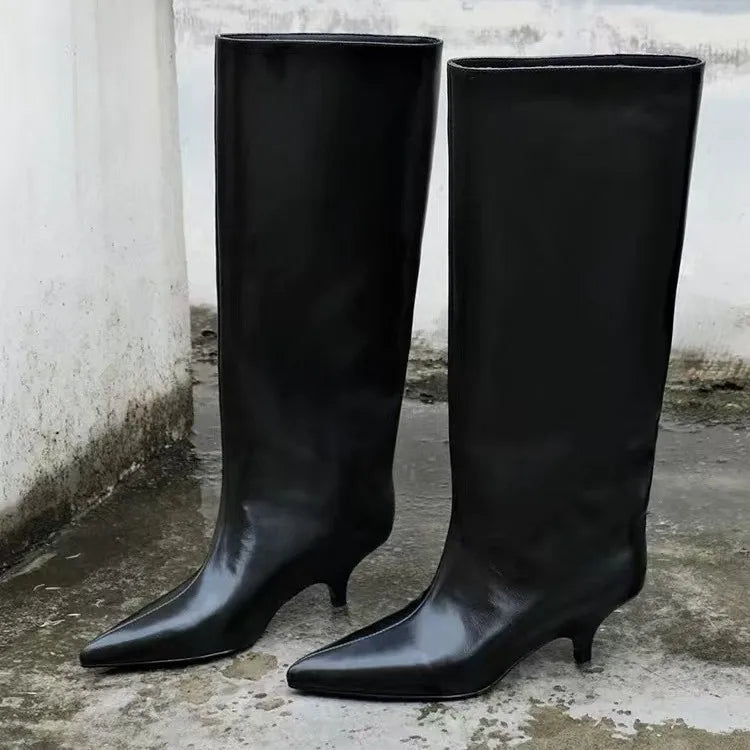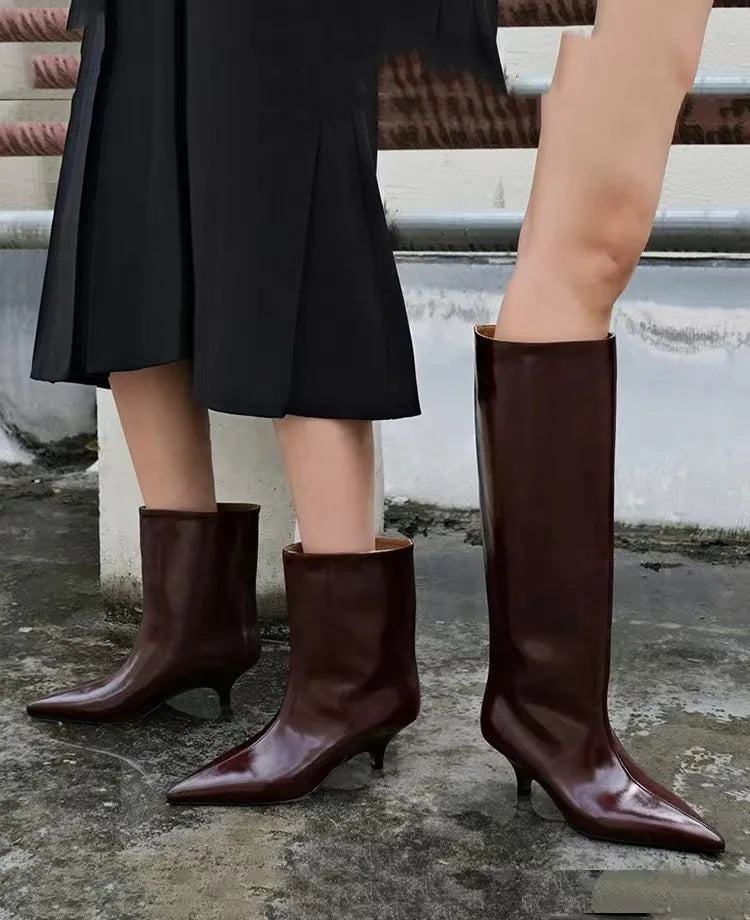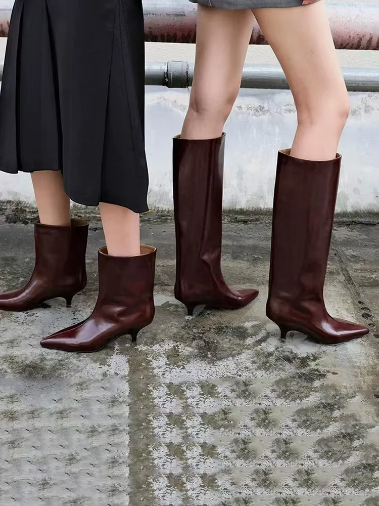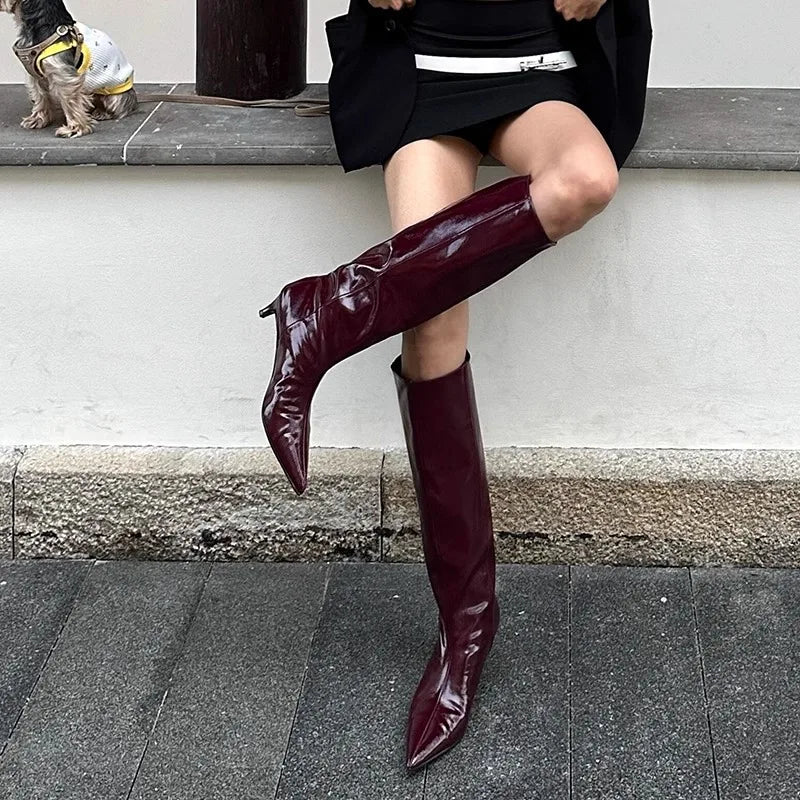 KYLETHOMASW - Burgundy Patent Leather High-Top Long Boots For Women Wine Red Pointed Toe Slip On Botas Largas De Mujer Kitten Low Heels Mature