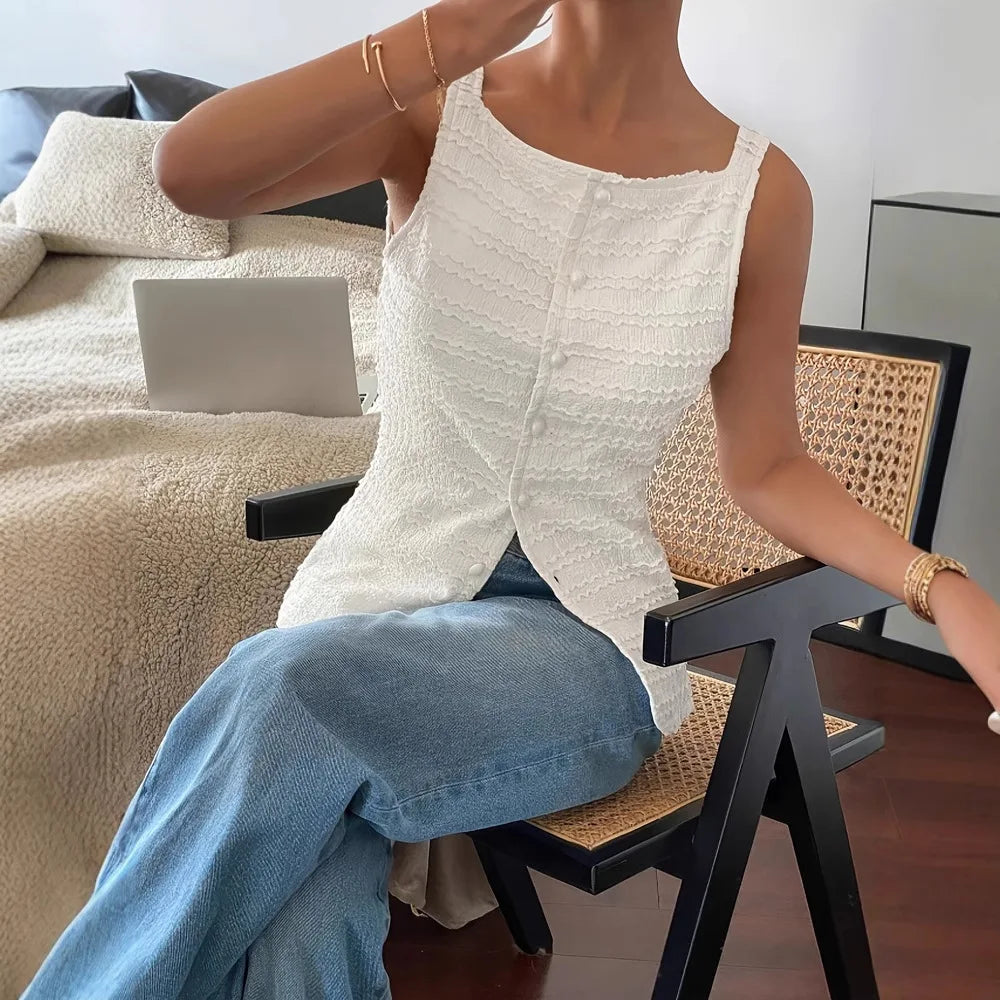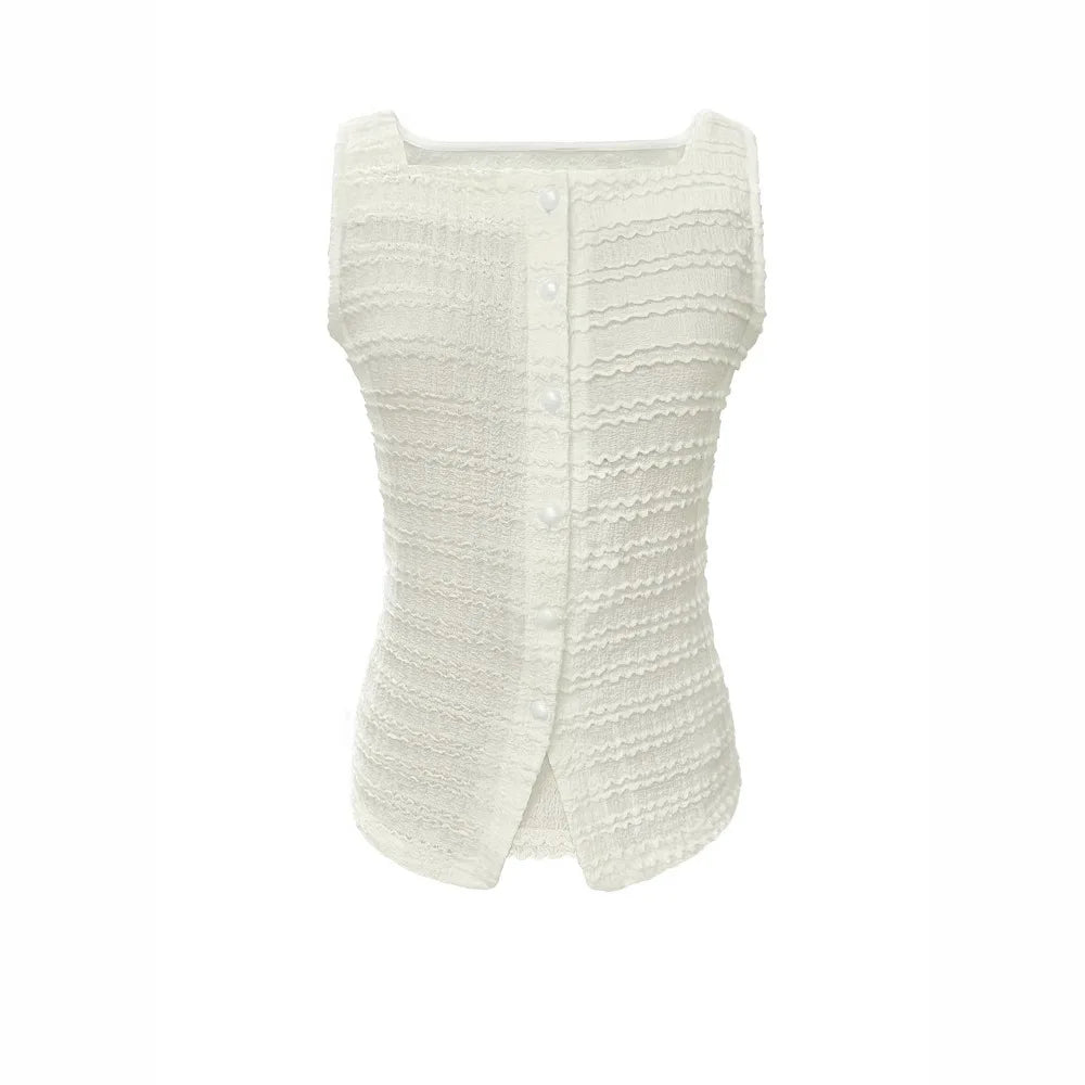 KYLETHOMASW - Elegant Women Solid T-Shirts Fashion Single Breasted Sexy Strap Sleeveless Button Tops Casual White Pleated Office Lady New Tees