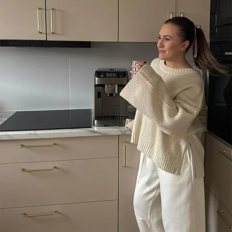 Kylethomasw - Fashion Solid Split Hem Round Neck Sweater Women Elegant Flare Long Sleeves Loose Knitted Pullover 2024 Lady Warm Commuting Tops