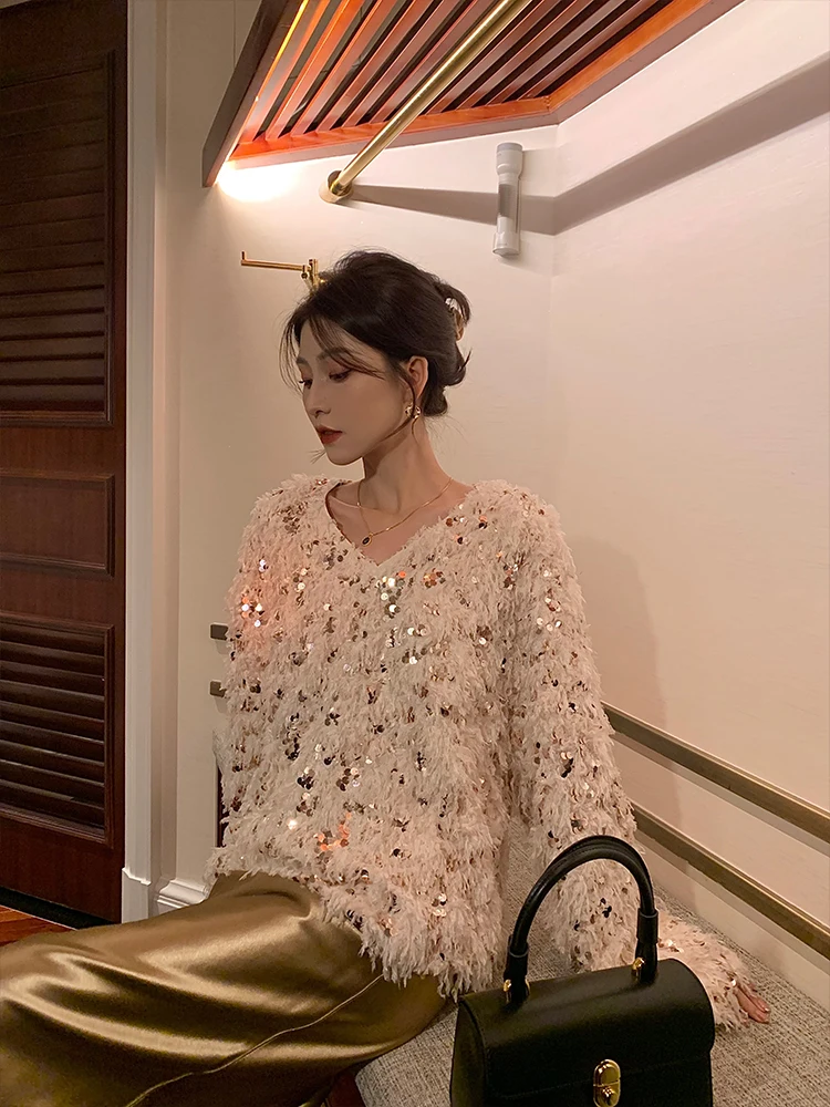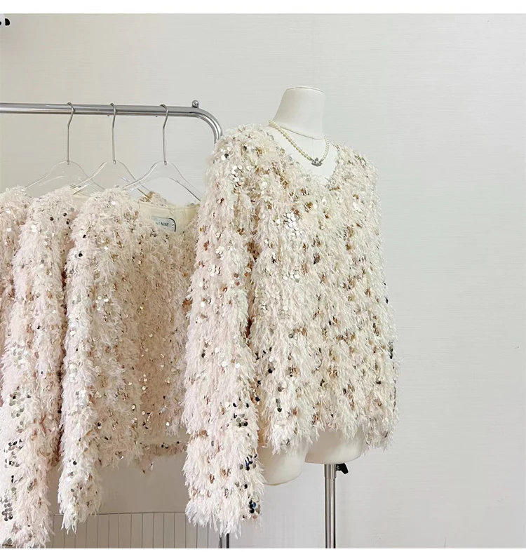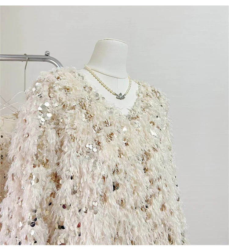 KYLETHOMASW - Luxury Tassel Feather T Shirt Women Spring Autumn Long Sleeve Party Sequins T-shirts Tops Tee Shirt Femme