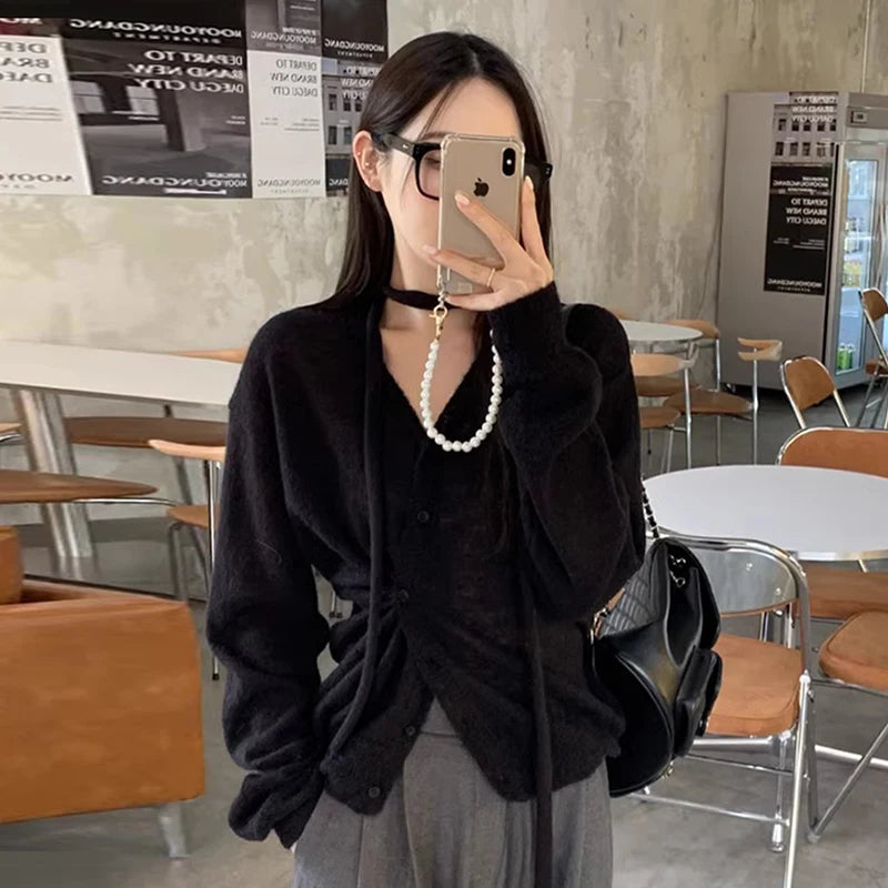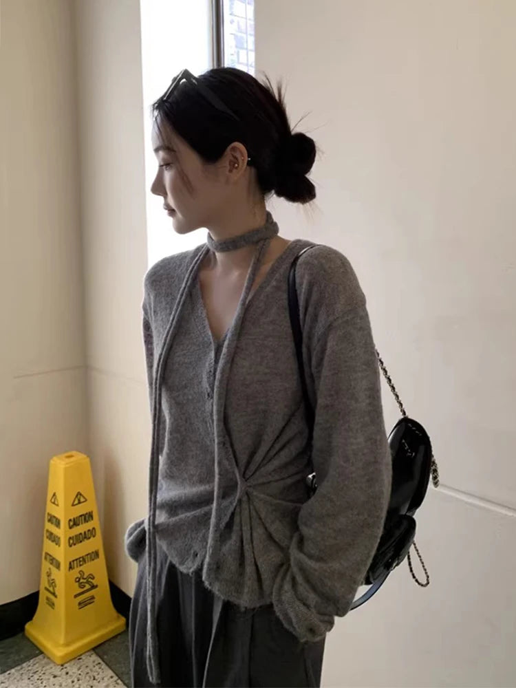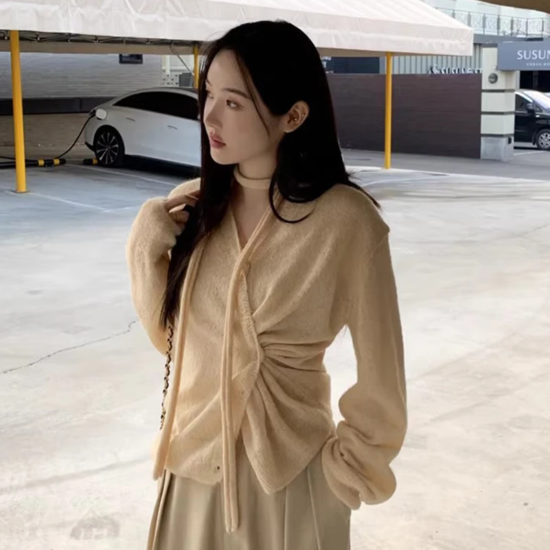 KYLETHOMASW - South Korea Chic Cardigan Simple Temperament V-neck Neck Irregular Buckle Waist Slimming Tops Long Sleeve Women Sweater