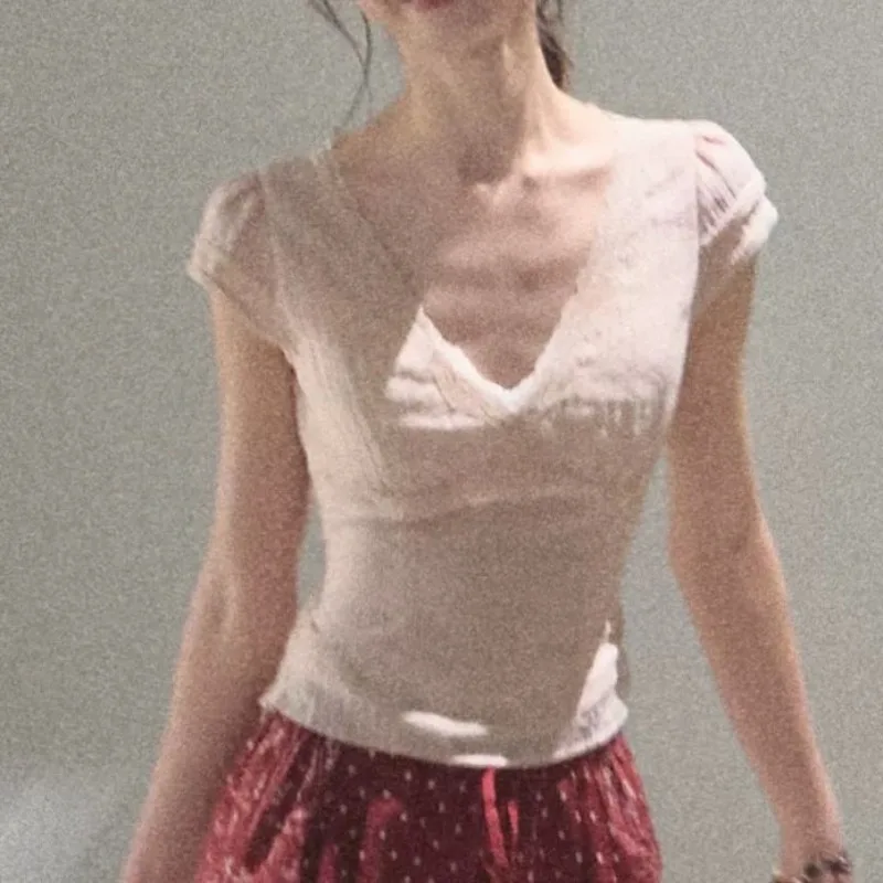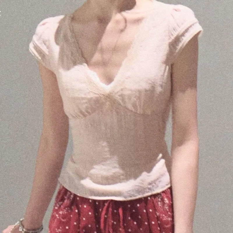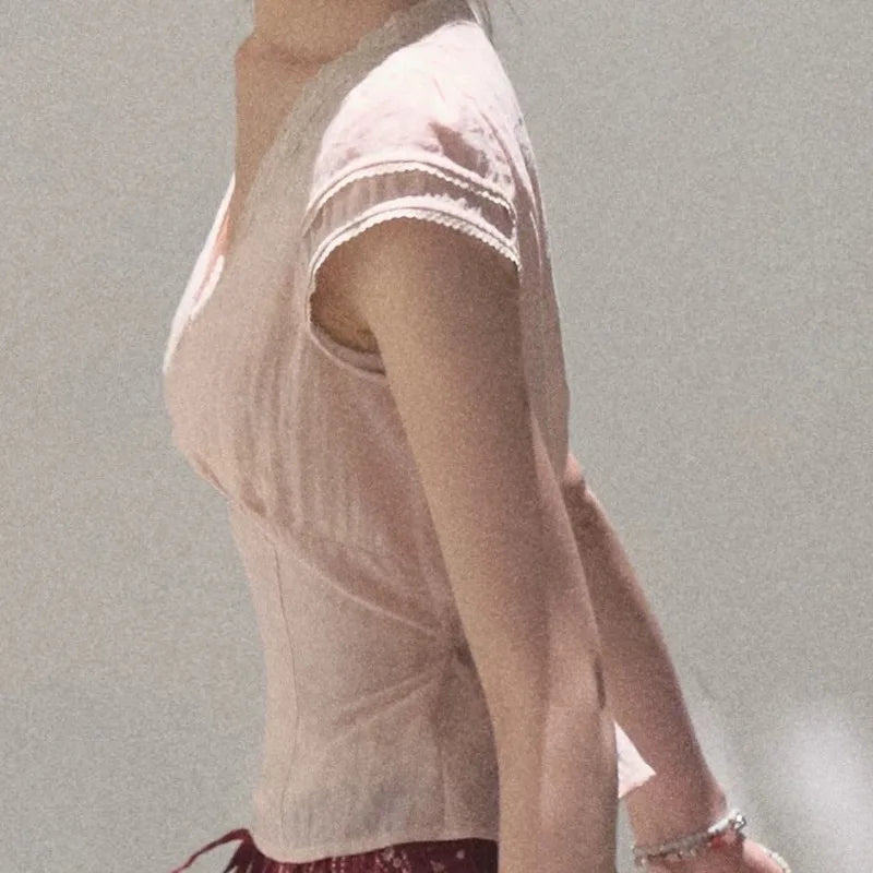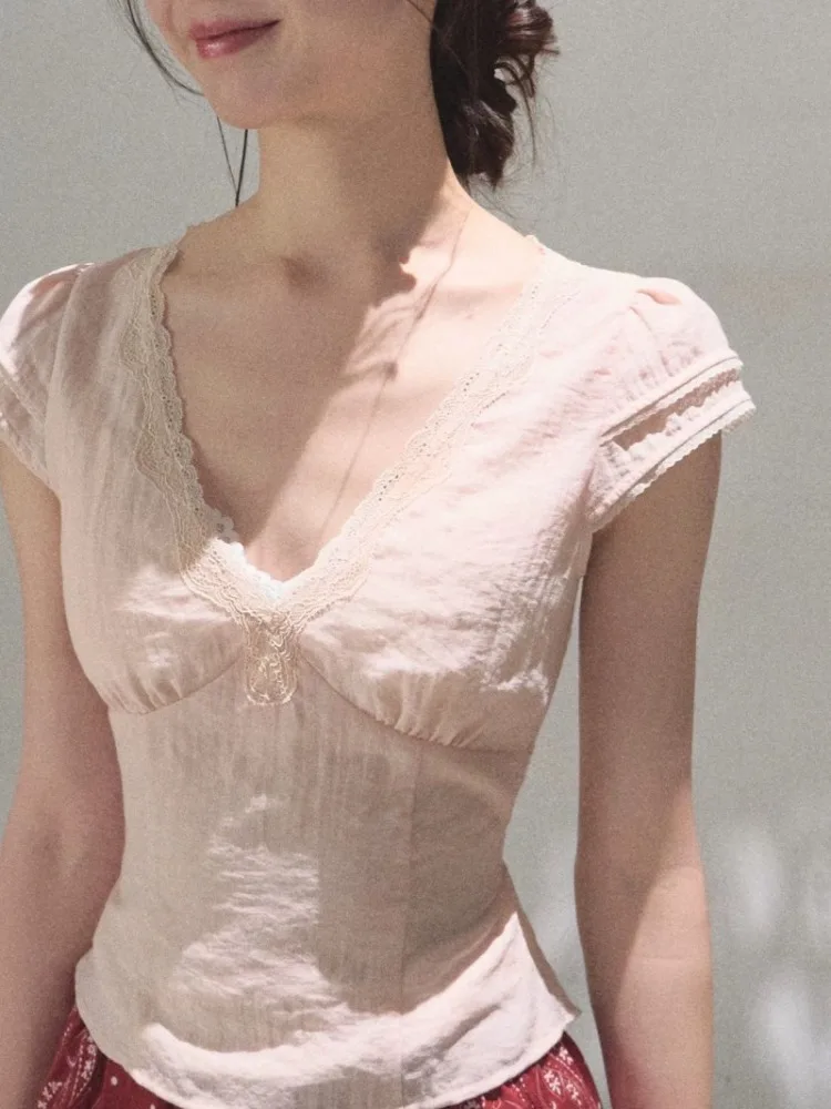 KYLETHOMASW  -  Sweet Shirts Women V Neck Lace Patchwork Bandage Slim Summer Fashion New Crop Tops Female Y2k Harajuku Casual Blouse