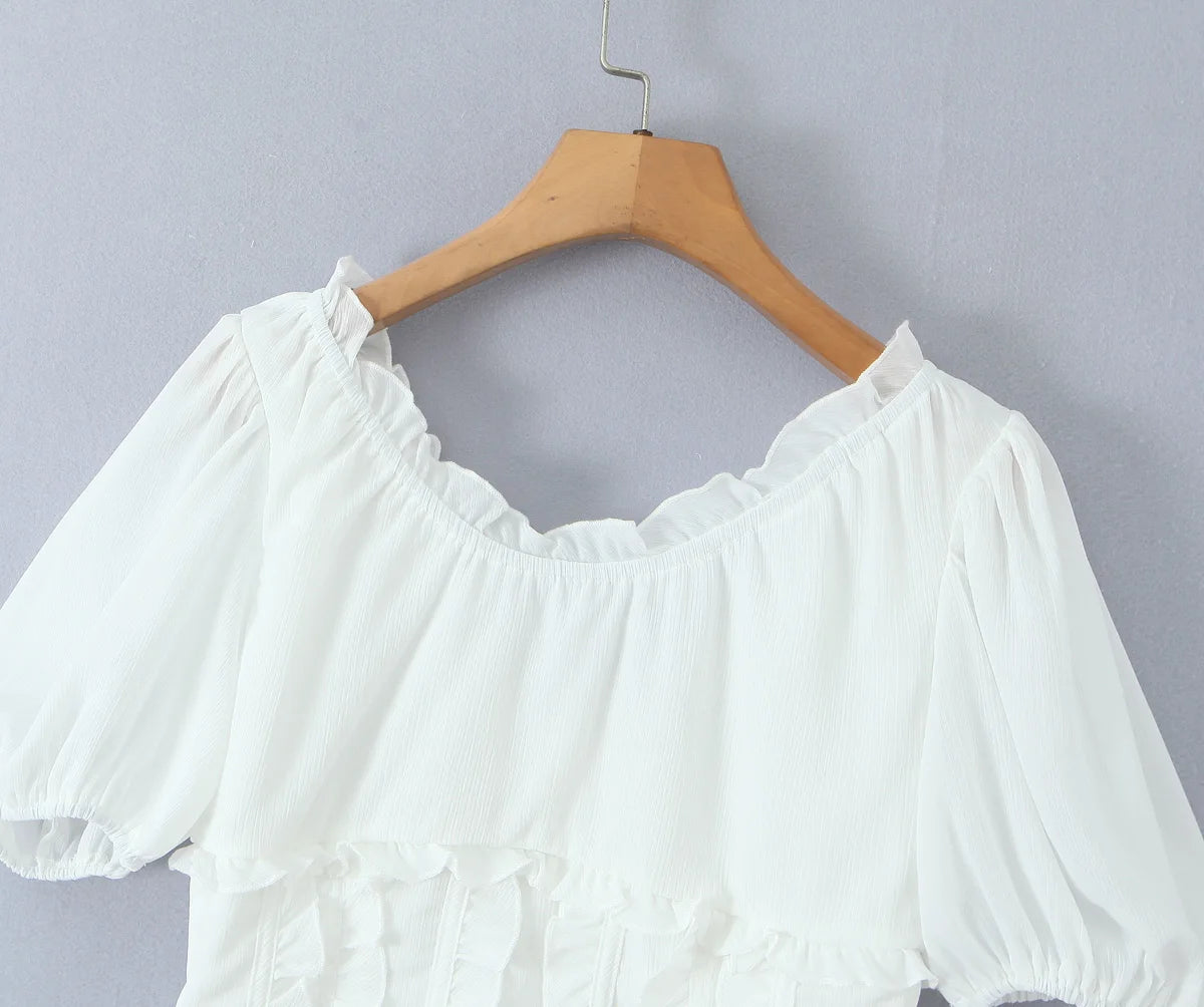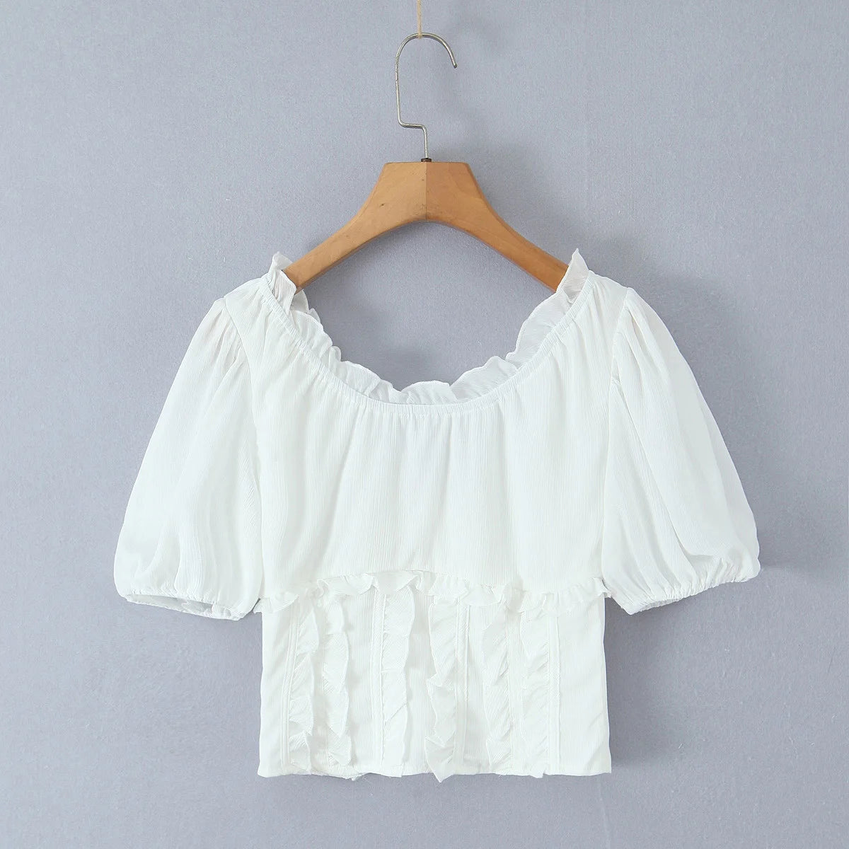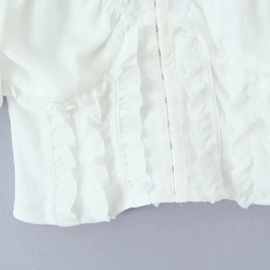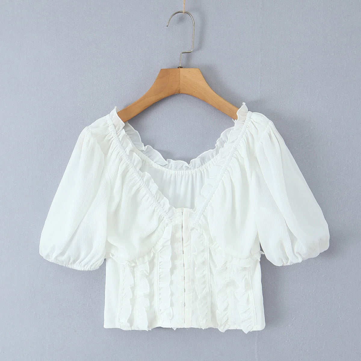 KYLETHOMASW  -  Sweet White Embroidery Hollow Out Hole Splice Lace Elastic U Collar Short Sleeve Shirt Women Center Buttons Slim Crop Tops