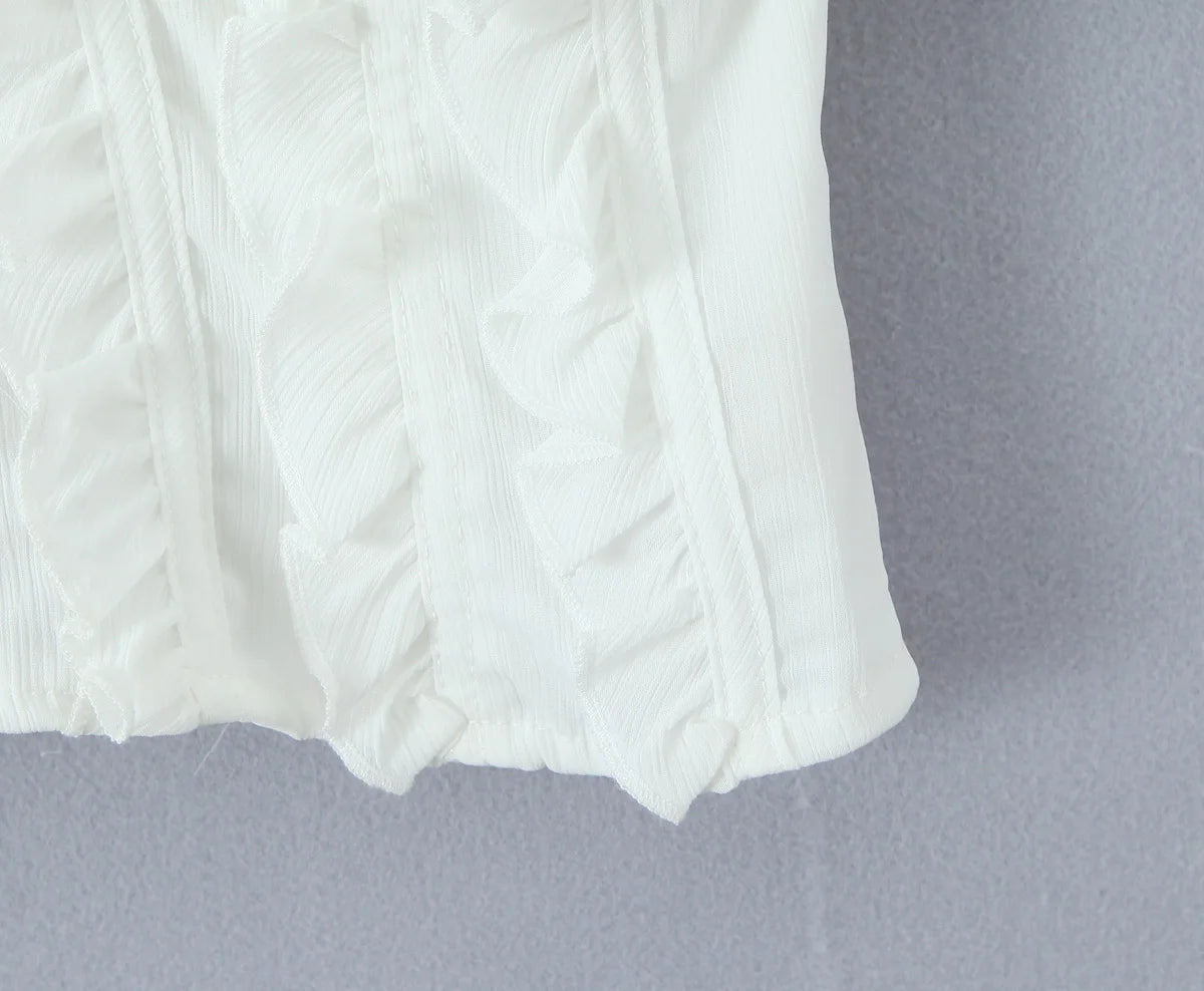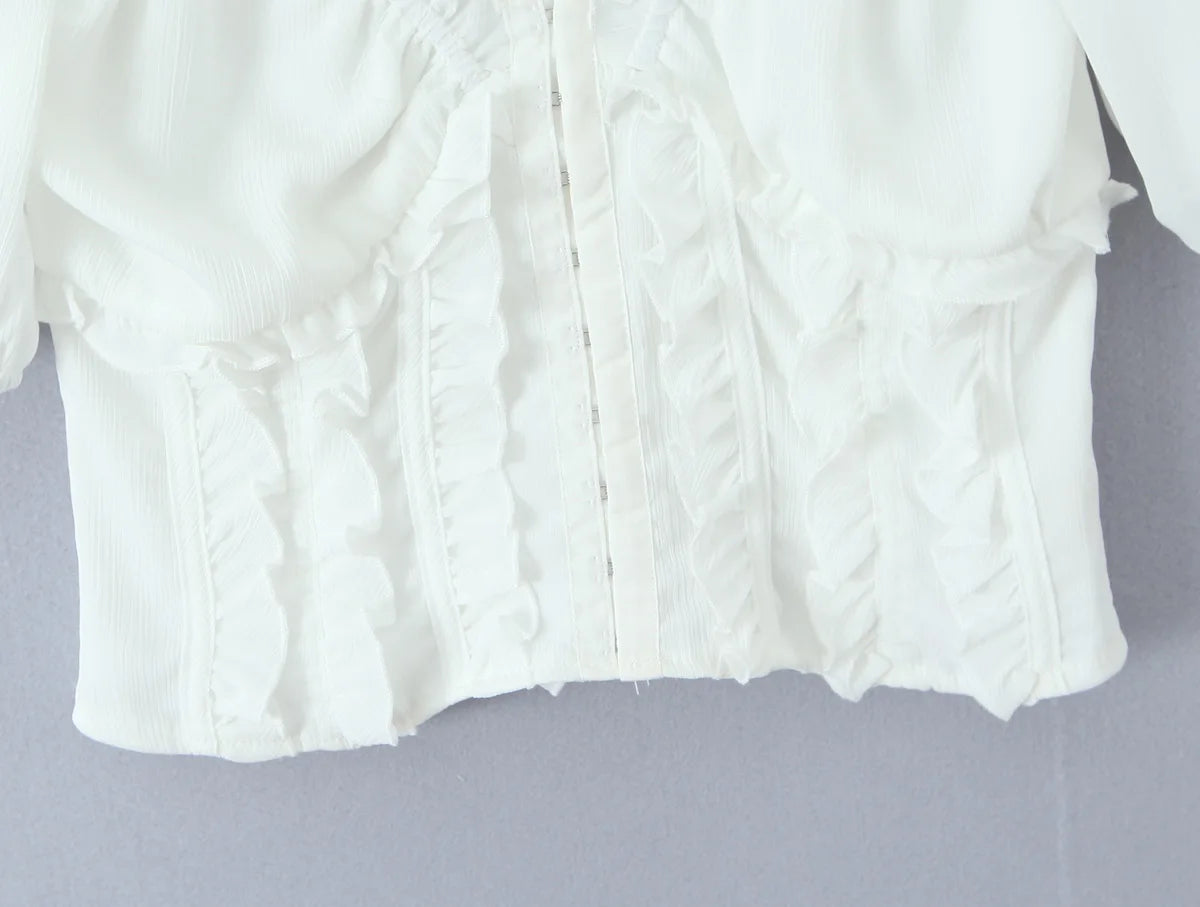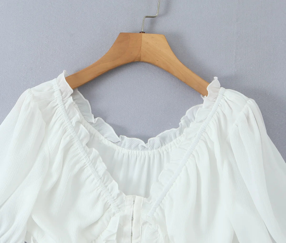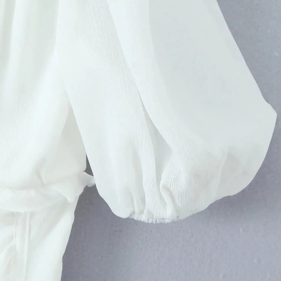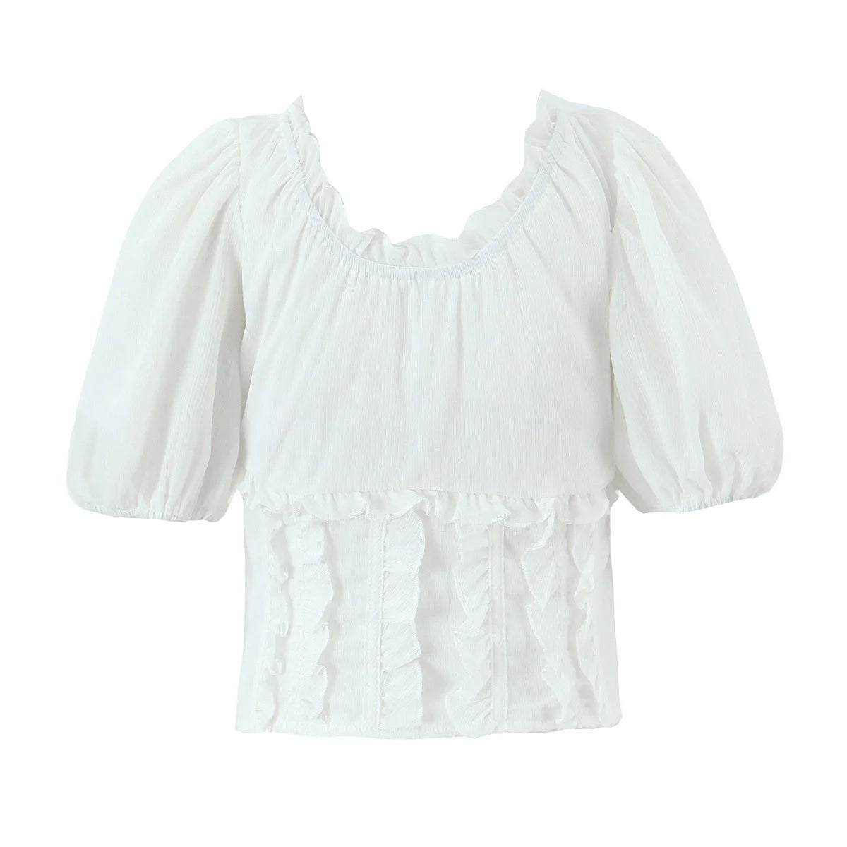 KYLETHOMASW  -  Sweet White Embroidery Hollow Out Hole Splice Lace Elastic U Collar Short Sleeve Shirt Women Center Buttons Slim Crop Tops