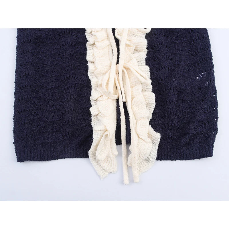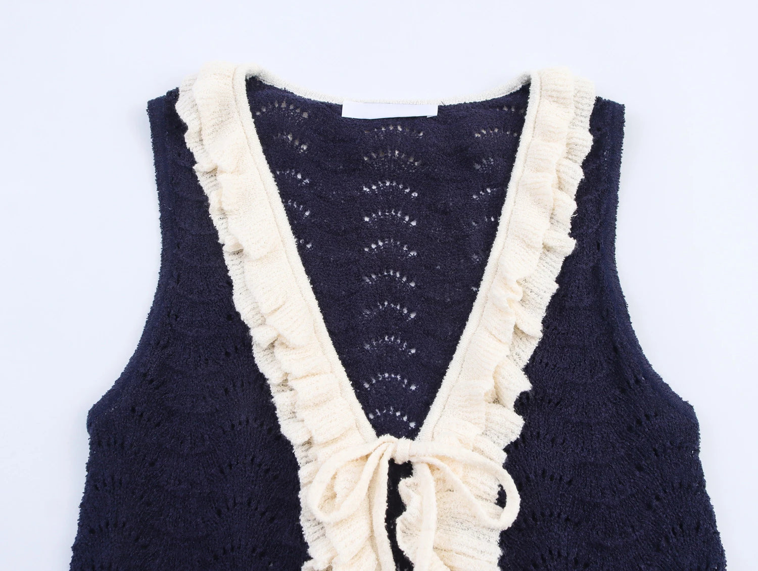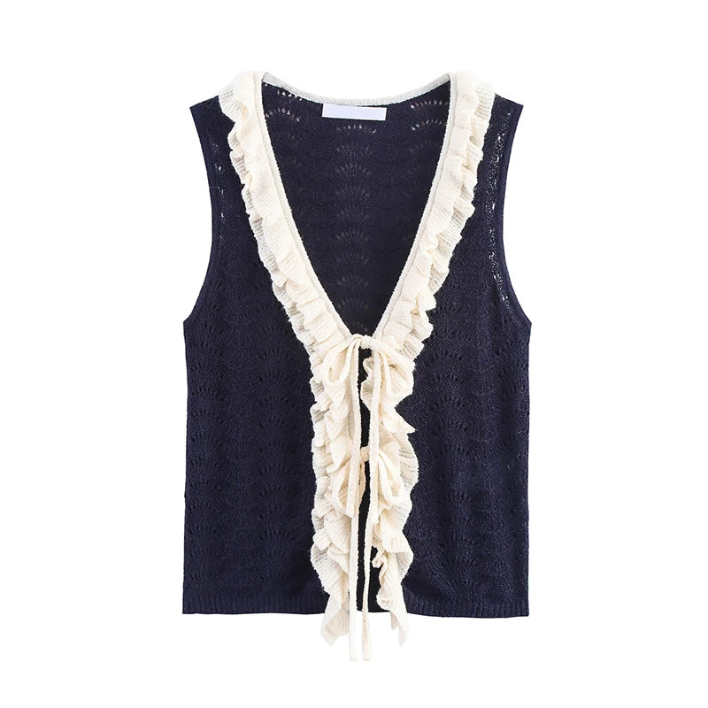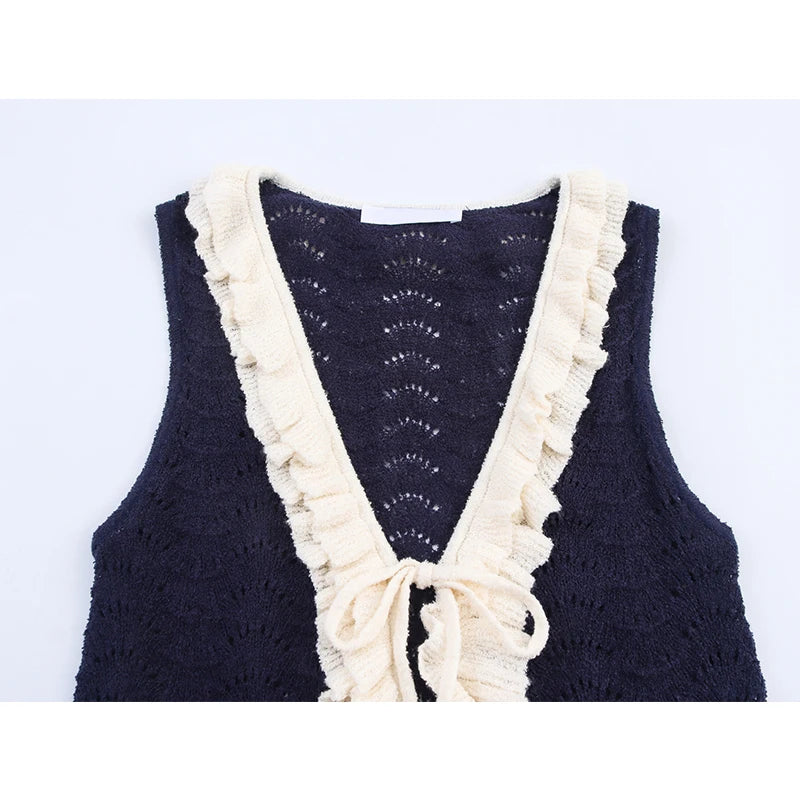 KYLETHOMASW  -  Women Contrasting Ruffle Knit Tank Tops Sexy V Neck Front Tie Holiday Casual Summer Crop Top