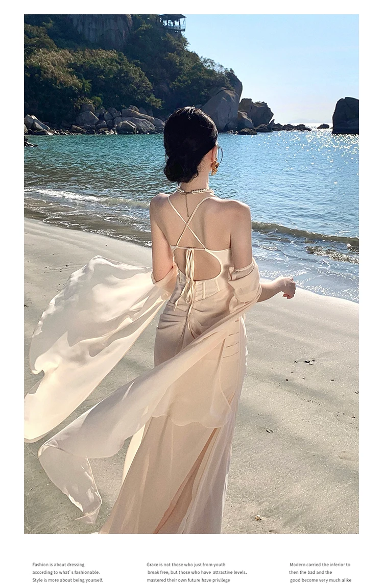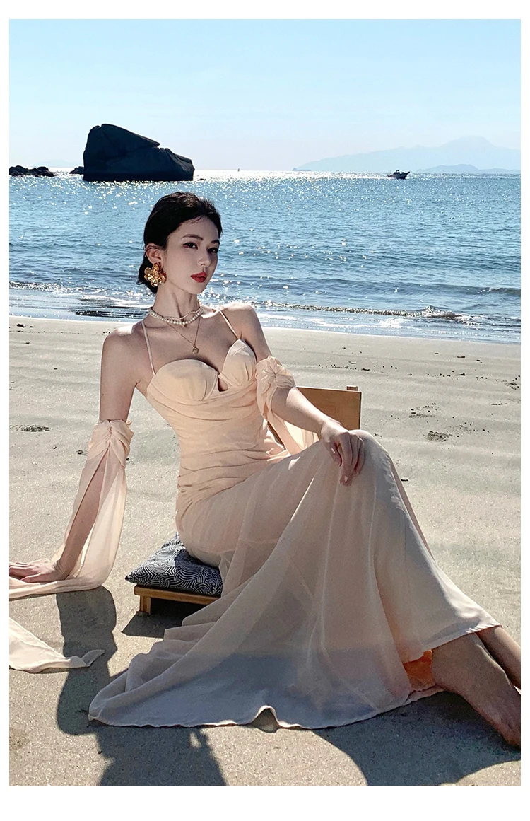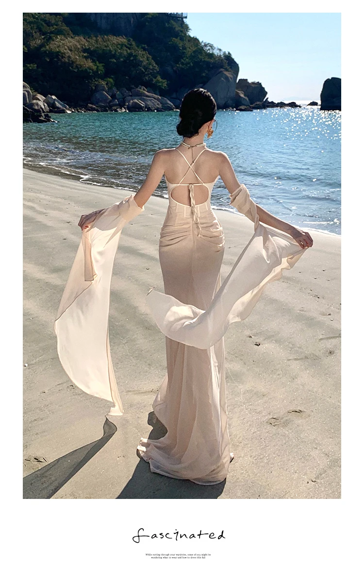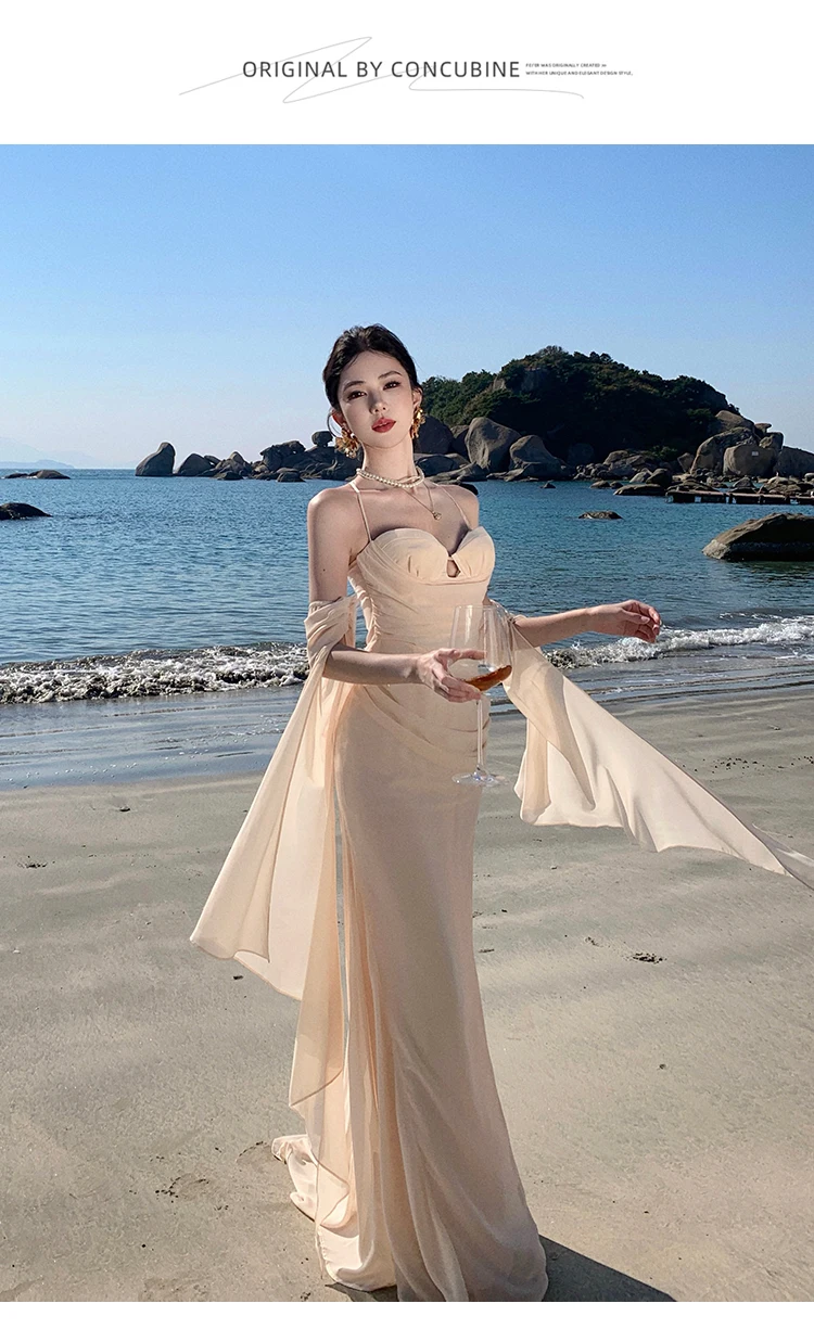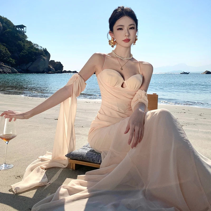KYLETHOMASW  -  French Summer Beige Sexy Club Spaghetti Strap Long Dress Women V Neck Backless Wrap Hip Pleated Fishtail Evening Dress 2025 Chic