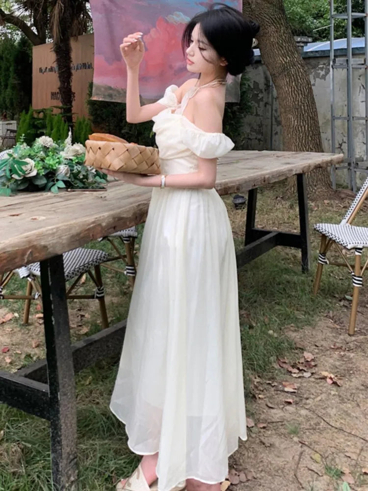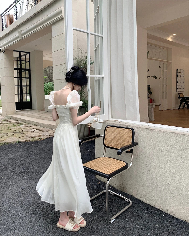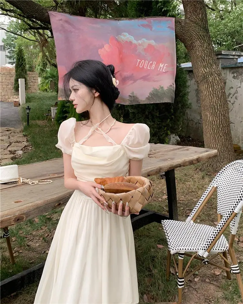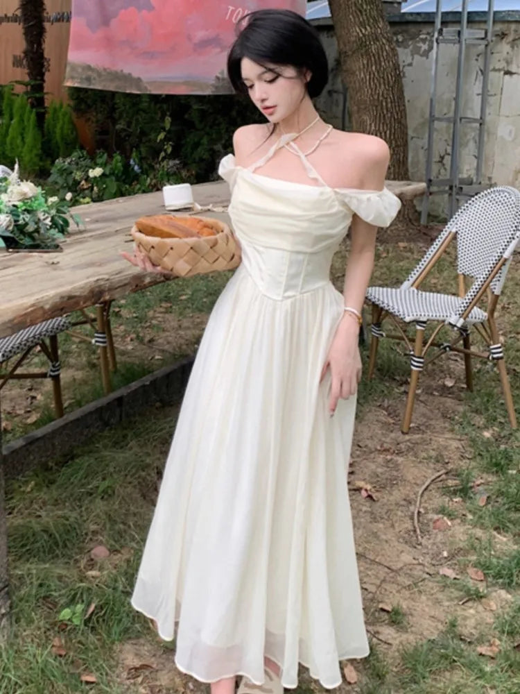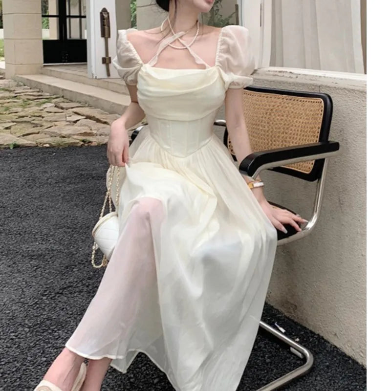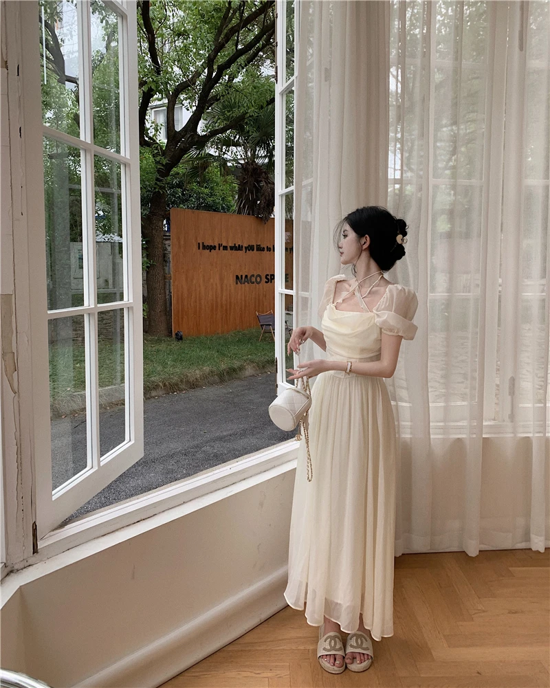 KYLETHOMASW - Summer Women Halter Midi Dress Elegant Female Chiffon Square Neck Party One Pieces Dresses French Solid New Vestidos Robe