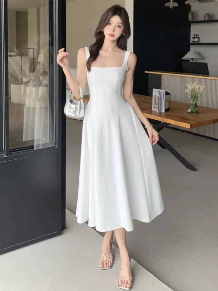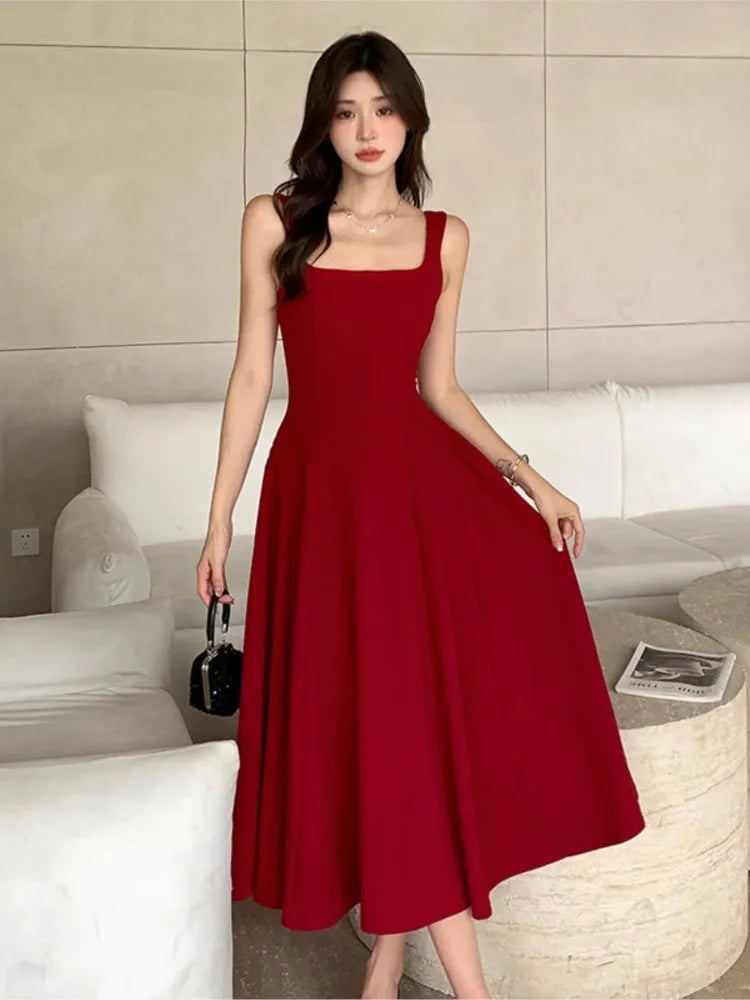 KYLETHOMASW - Y2K Summer Elegant Women Solid Midi Dress Vintage Sleeveless A-Line Birthday Evening Party Dress Princess Slip Vestidos