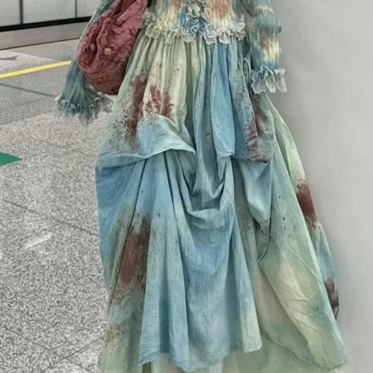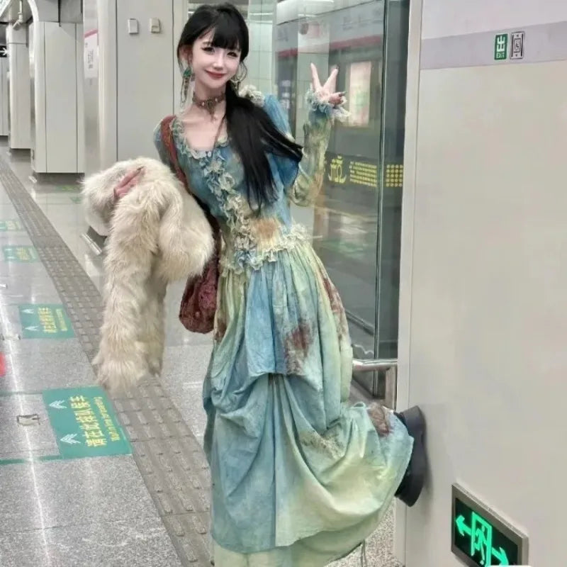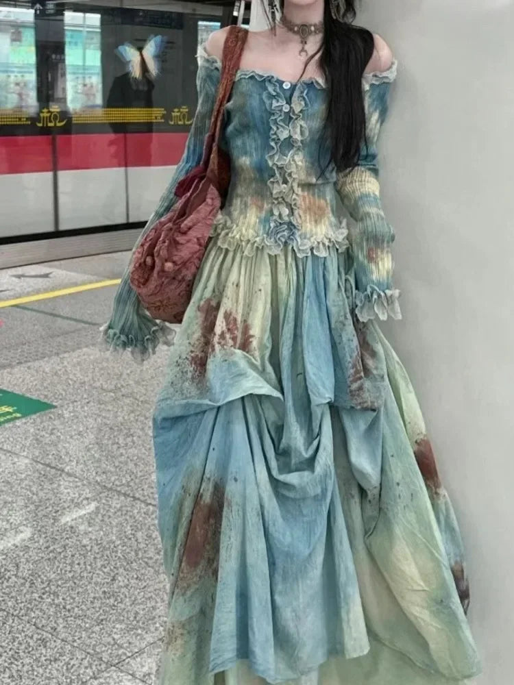 KYLETHOMASW - Elegant Vintage Tie Dye Slim Fit Fungus Long Sleeve Tops Women+ Y2k High Waist Ruched Skirts 2025 Summer New Two Piece Sets