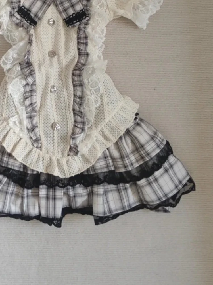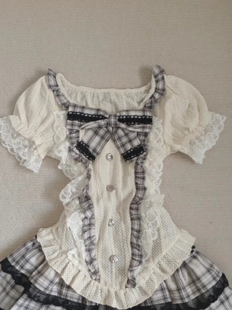 KYLETHOMASW - Japanese Sweet Kawaii Women 2 Piece Set Cute Bow Lace Tops +Mini Puffy Skirt New Fashion Harajuku Y2k Plaid Preppy Style Outfits