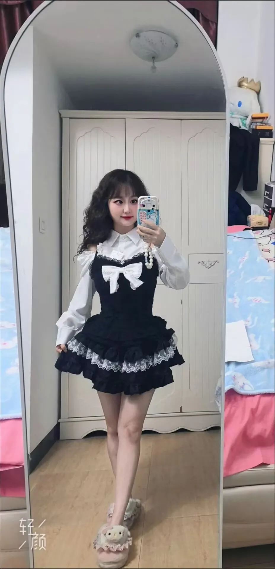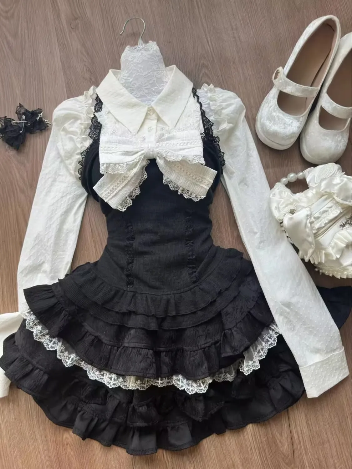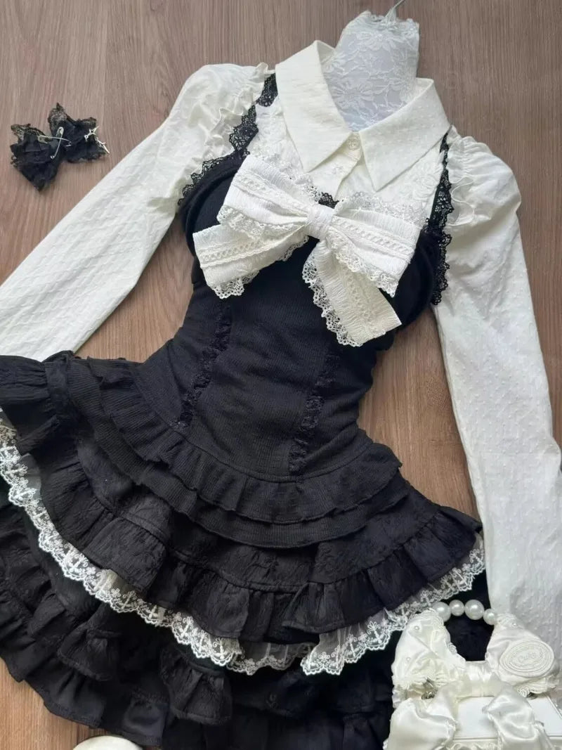KYLETHOMASW - Y2k Aesthetic Lolita Style 3 Piece Set Women Kawaii White Shirt Bow Lace Vest Ruffle Mini Skirts Korea Fashion Gothic Skirt Sets