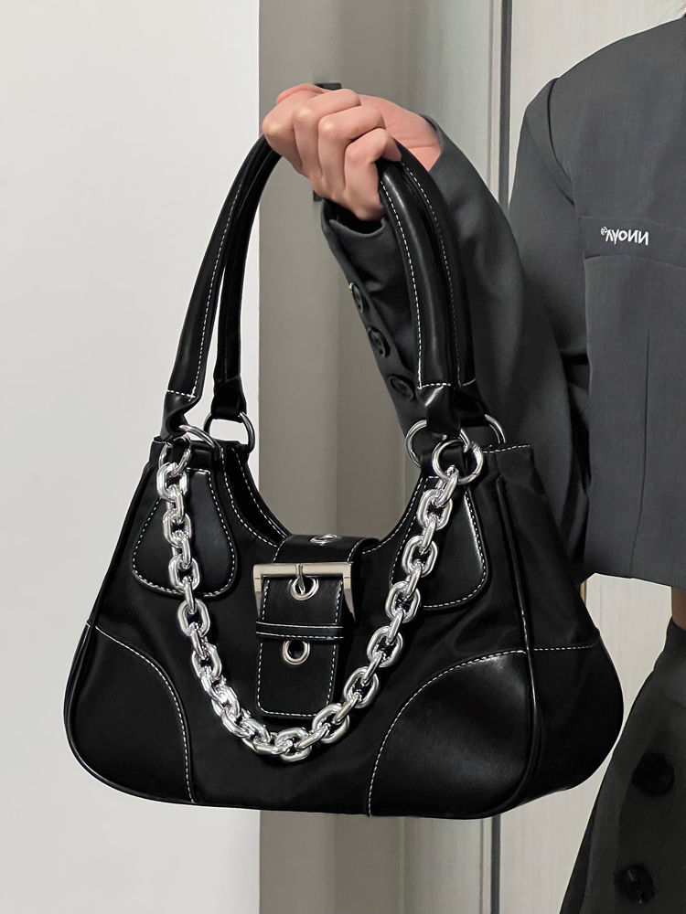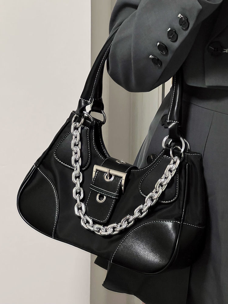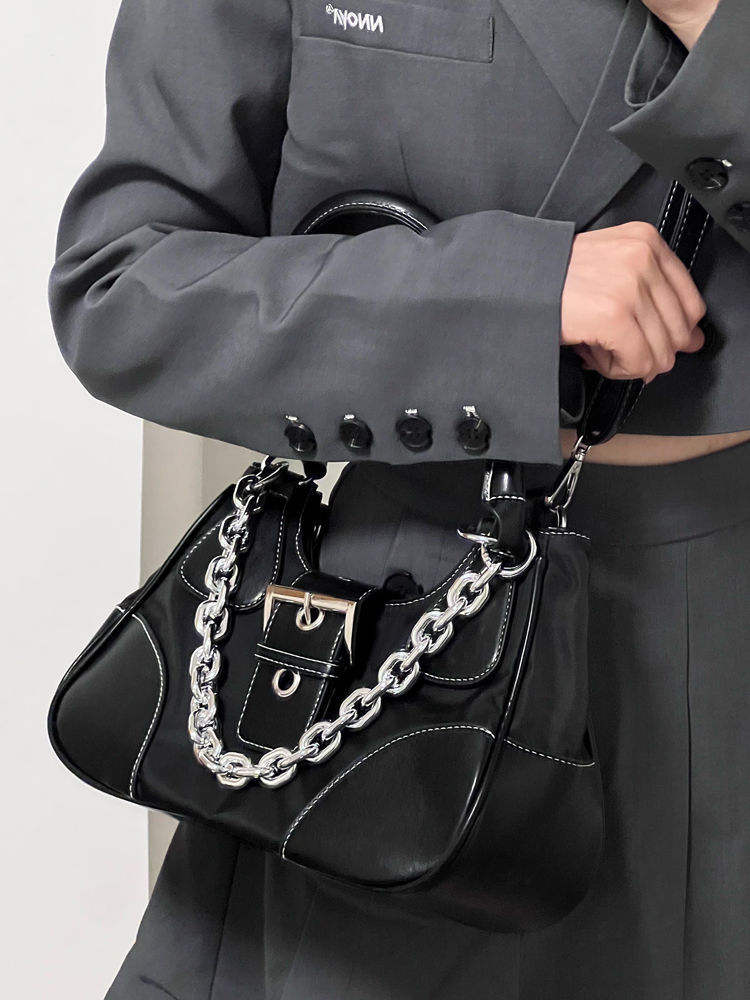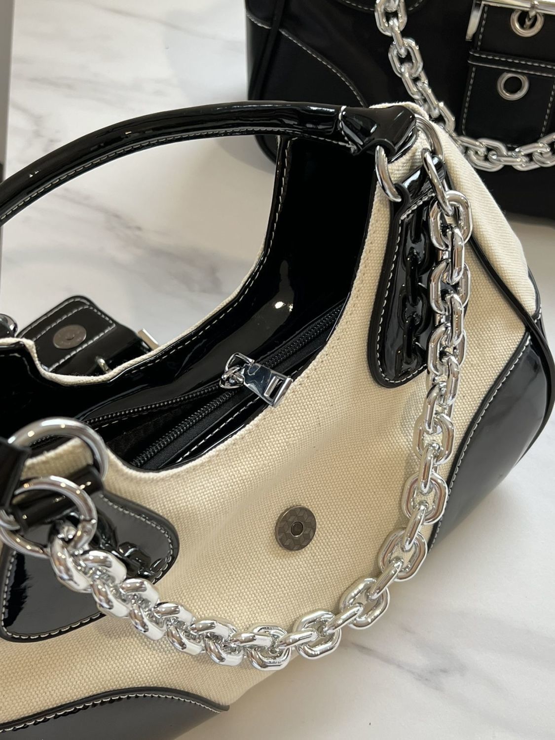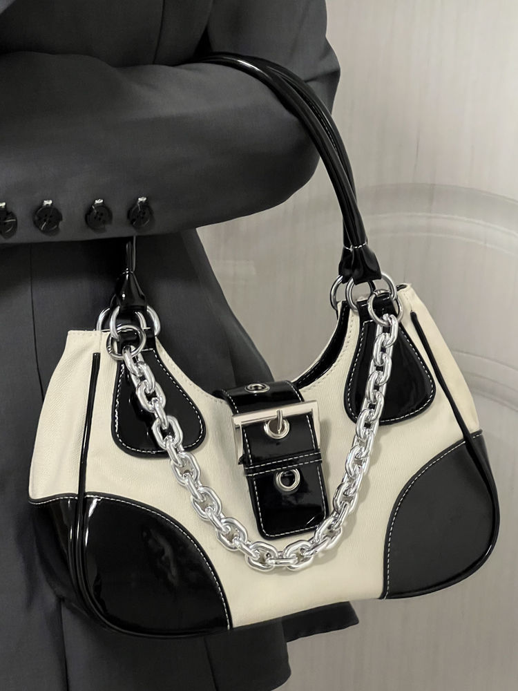 Kylethomasw Preppy Style Cool Girl Metal Chain Punk Motobike Crossbody Bag Shoulder Messenger Bag Splicing Cloth Y2K Vintage Canvas PU Bag