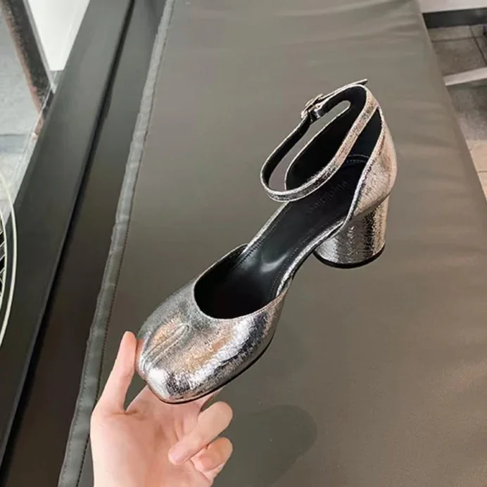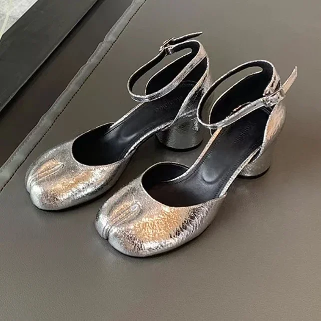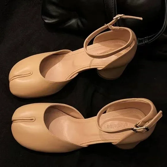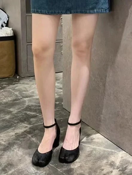 Kylethomasw 2024 Fashion Tabi Ninja Shoes WomenRound Split Toe Shallow Thick Heel Sandals Single Mid Heel Mary Janes Shoes Female Pumps