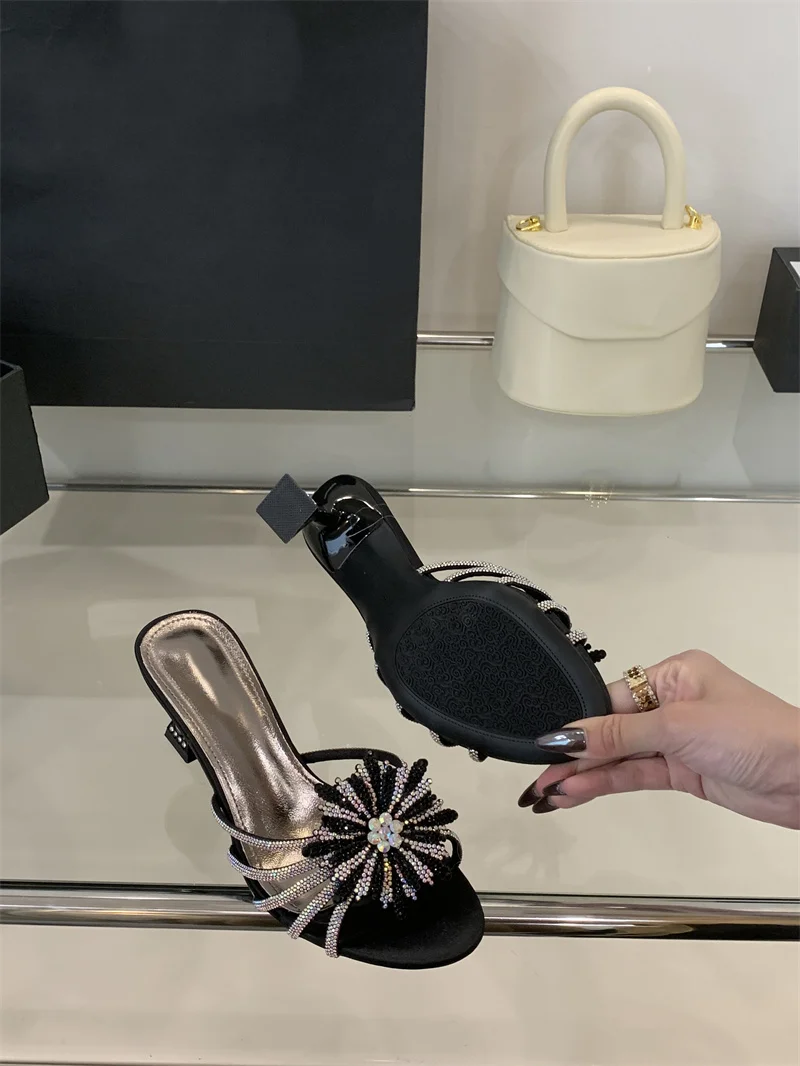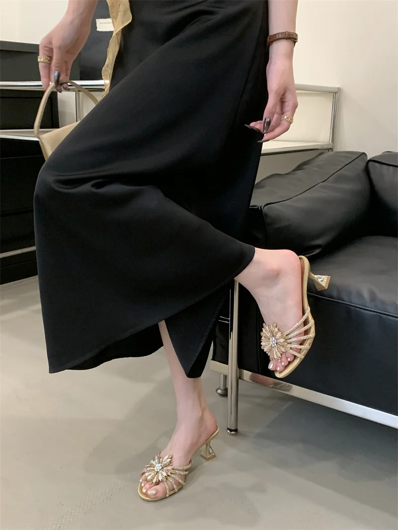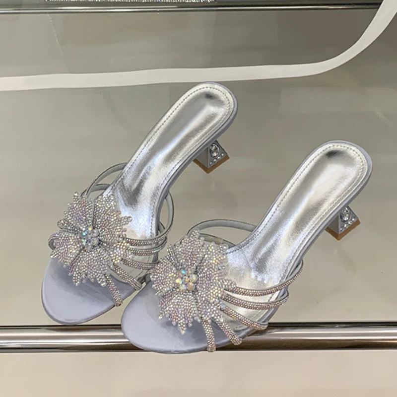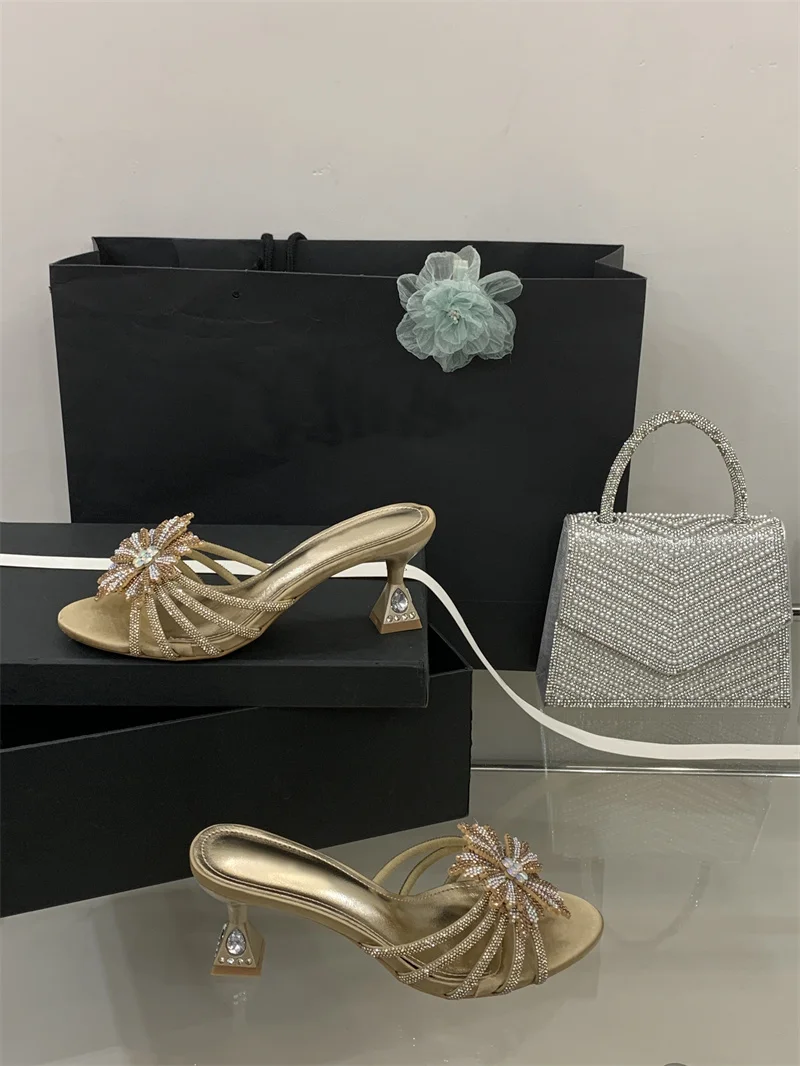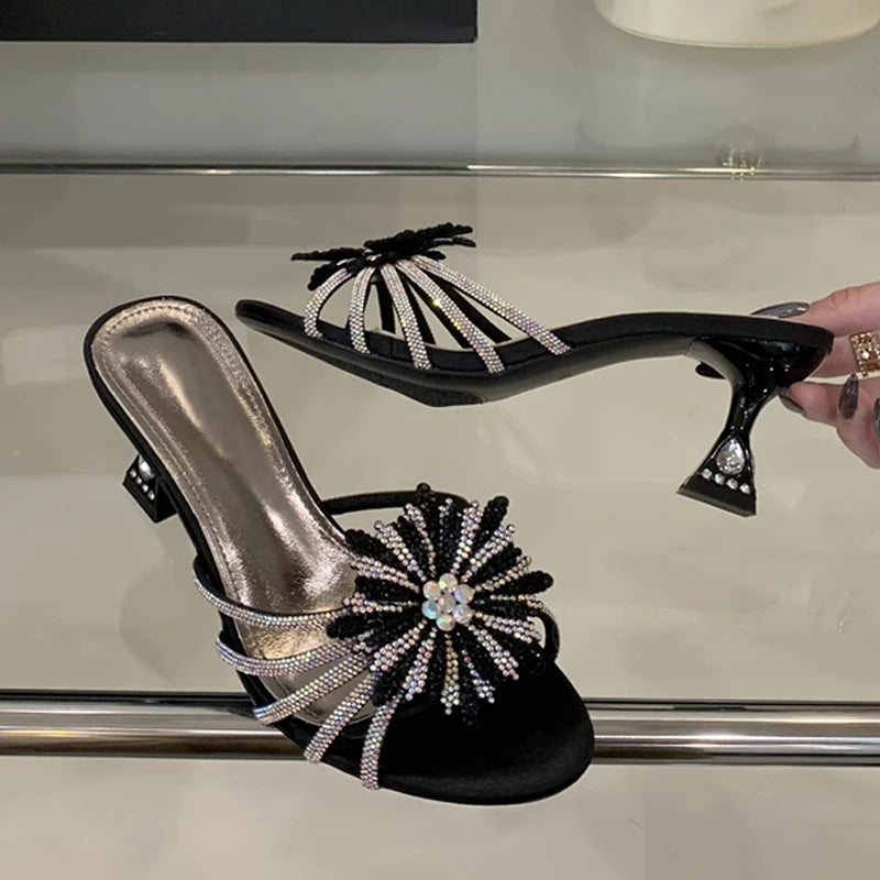 KYLETHOMASW  -  2025 New Gold Silver Crystal Gem Strange Low Heels Slippers Women Rhinestone Flowers Summer Party Prom Shoes Mules Sandals