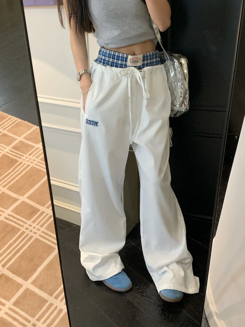 Kylethomasw American Contrast Color Patchwork Loose Wide Leg Pants Women Autumn New High Waist Lace-up Letters Embroidered Casual Pants