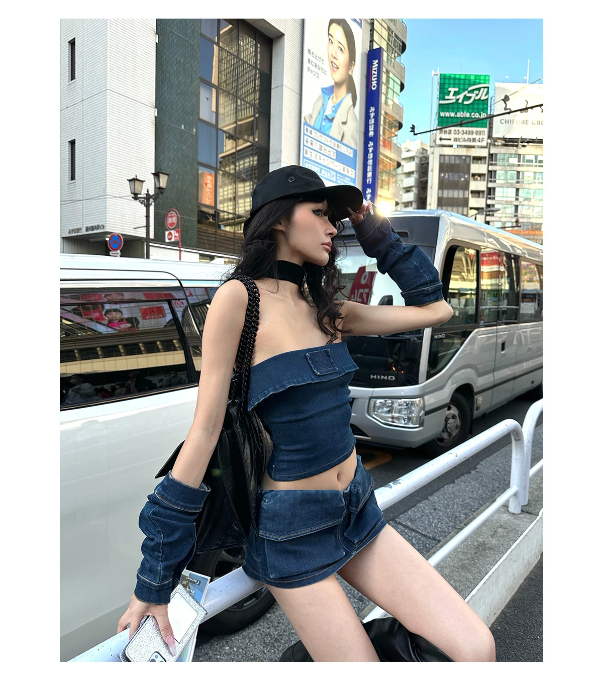KYLETHOMASW - American Retro Denim Strapless Backless Y2k Crop Top Low-waisted Cargo Shorts Streetwear 3 Piece Sets Womens Outifits