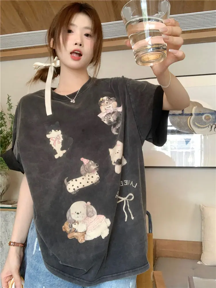 Kylethomasw American Retro Kawaii Doggy Print Oversized T-shirts for Women Summer Cutecore Cat Kitty Graphic Tops Short Sleeve Tops
