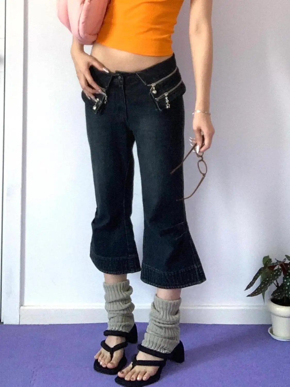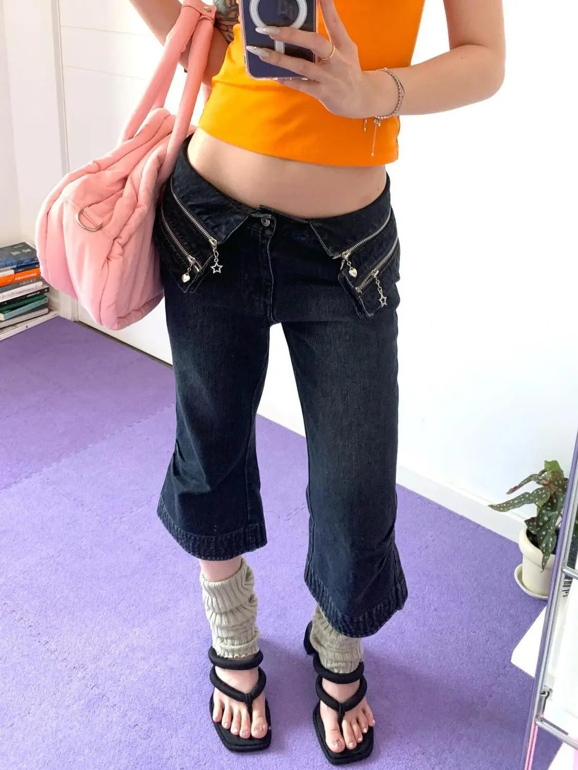 KYLETHOMASW  -  American Washed Flip Waist Design Flared Cropped Pants for Women Casual Low Waist Slimming Wide Leg Jeans for Women
