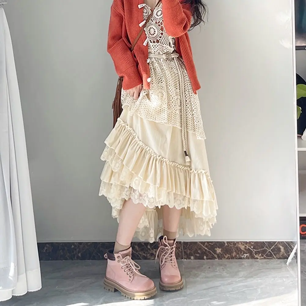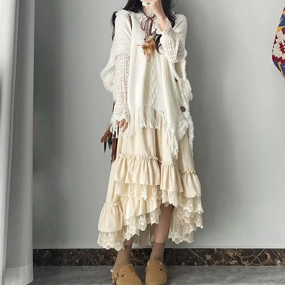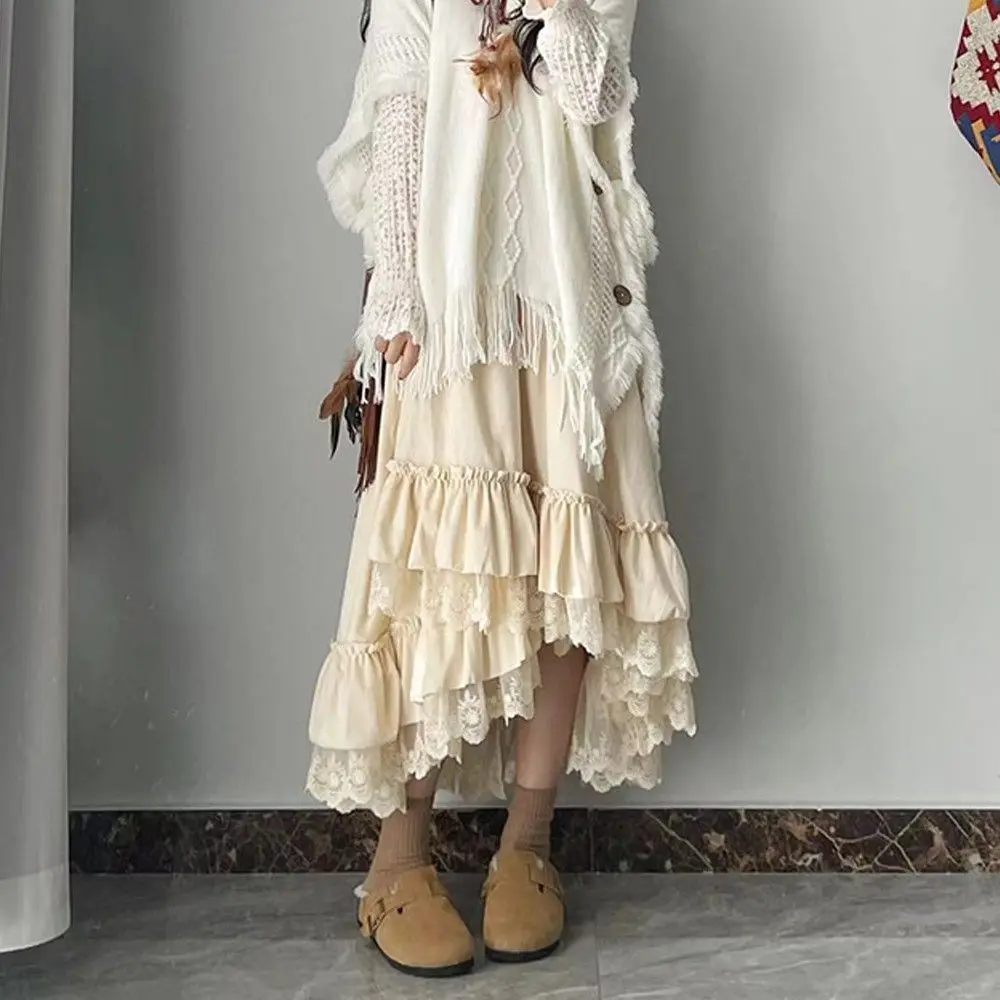 KYLETHOMASW - Autumn and Winter Forest Style Bohemian Vintage Lace Splicing Thick Velvet Long Skirts for Women High Waist A-line Cake Skirt
