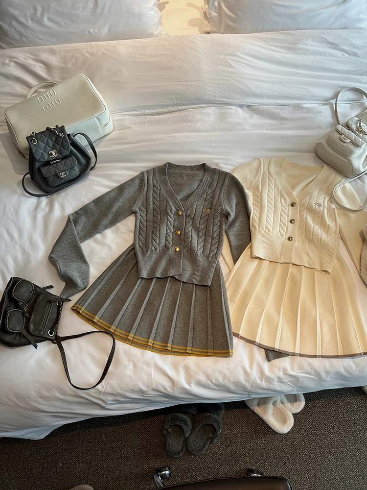 KYLETHOMASW - Autumn Knitted Two Piece Skirt Set Women Long Sleeve Single Breasted V-neck Top Mini Pleated Skirt Korean Chic Female Outfit New