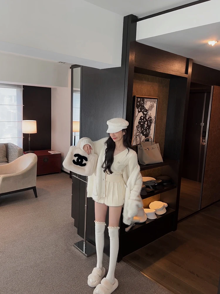 KYLETHOMASW  -  Autumn Knitted Two Piece Skirt Set Women Long Sleeve Single Breasted V-neck Top Mini Pleated Skirt Korean Chic Female Outfit New