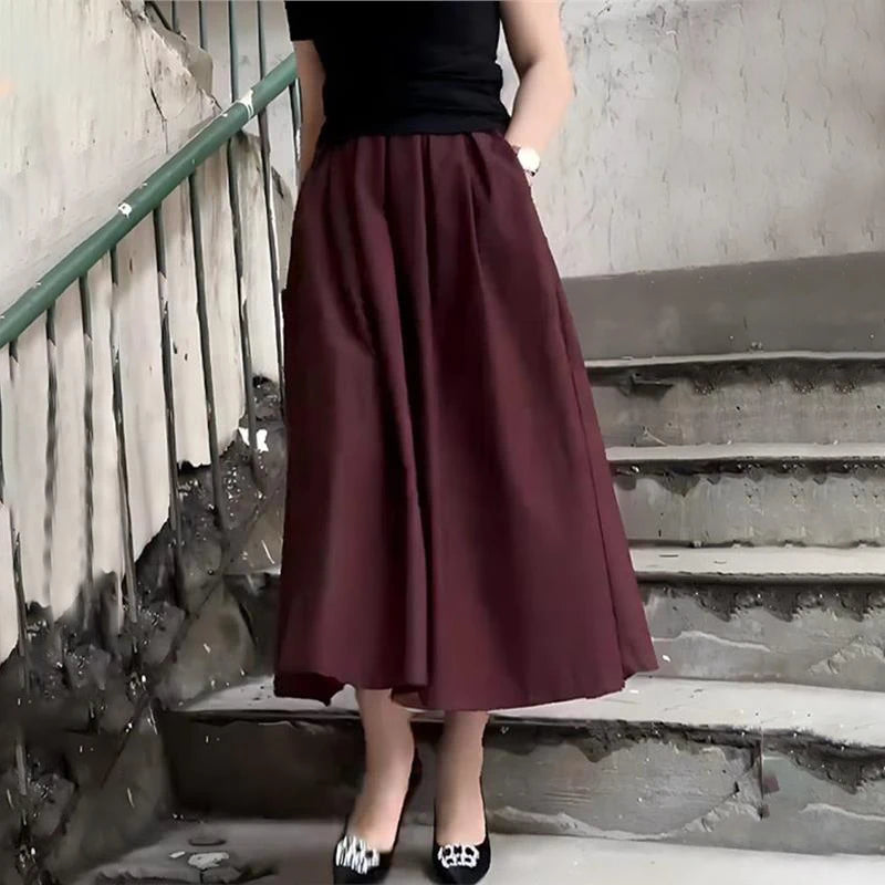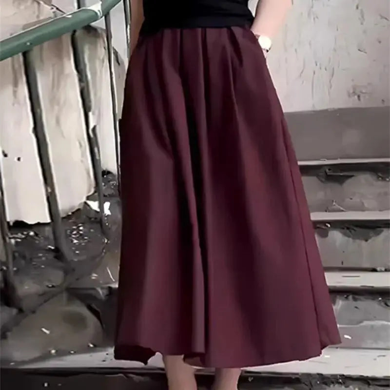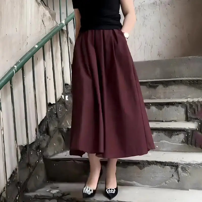 KYLETHOMASW - Autumn New French Elegant Women's A-Line Skirt Solid Color High Waist Casual Loose Pleated Skirt Office Lady Midi Faldas K956