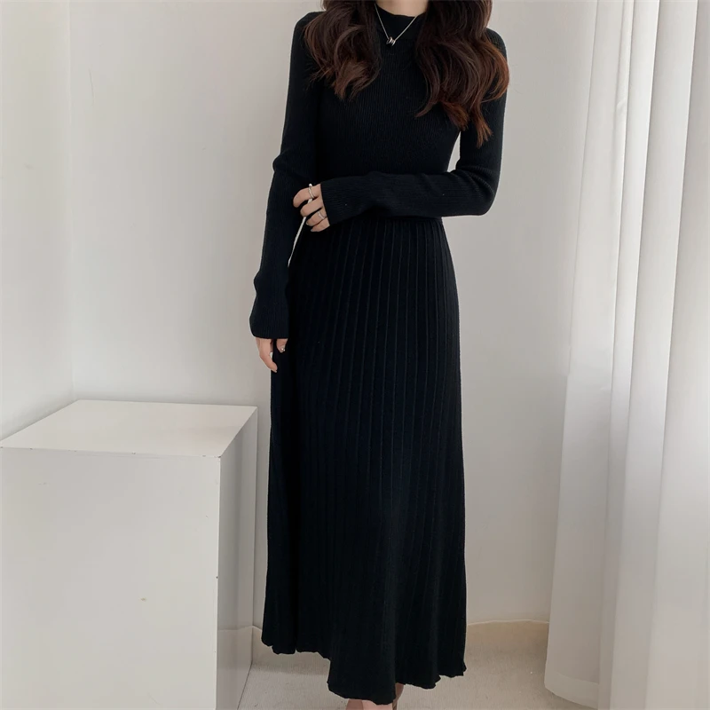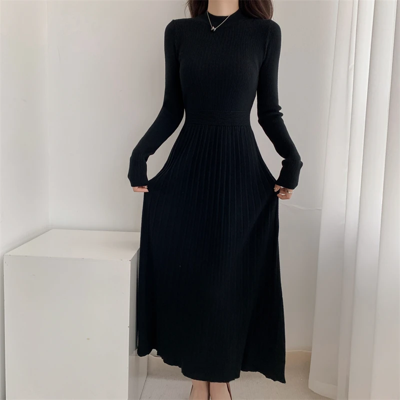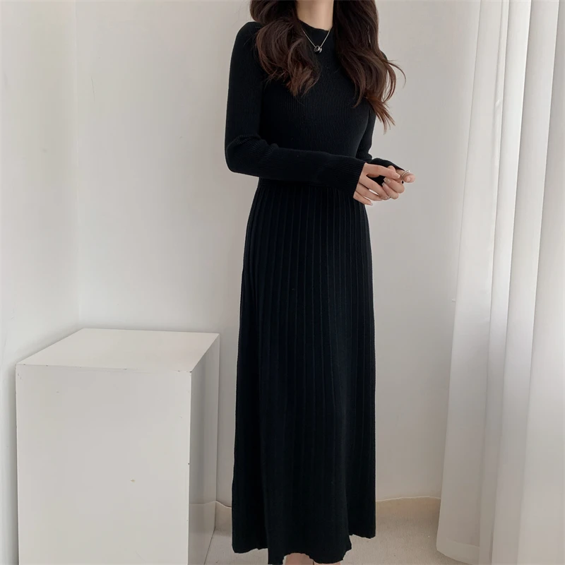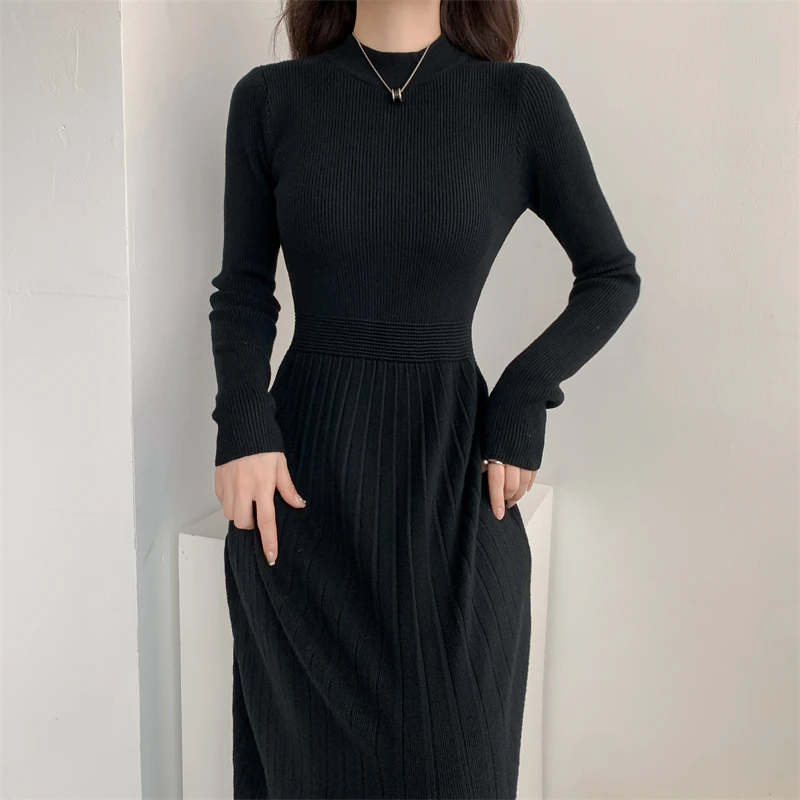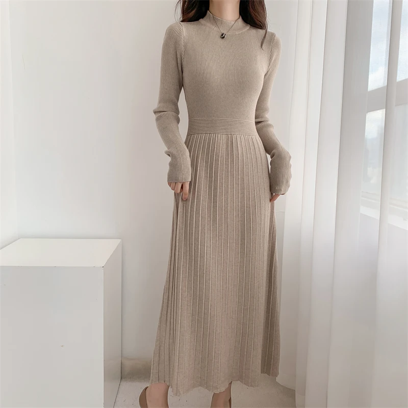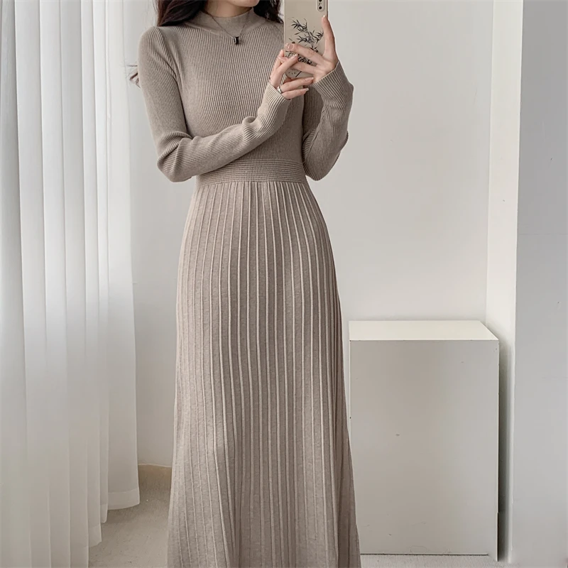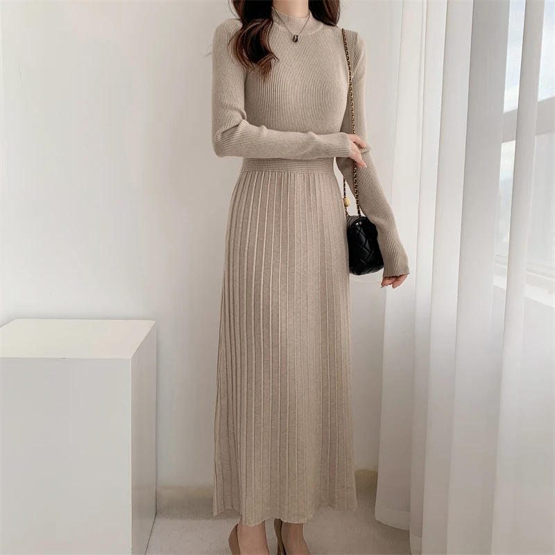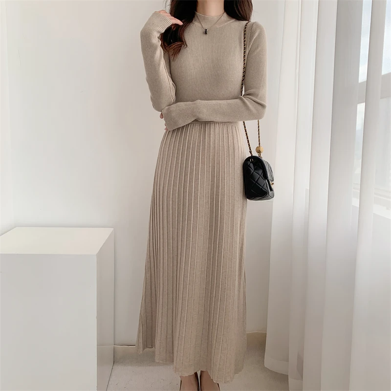 Kylethomasw Autumn/Winter British Style Celebrity Knitted Dress Solid Half High Neck Slim Fit Inner Matching Coat Pleated Long Dress