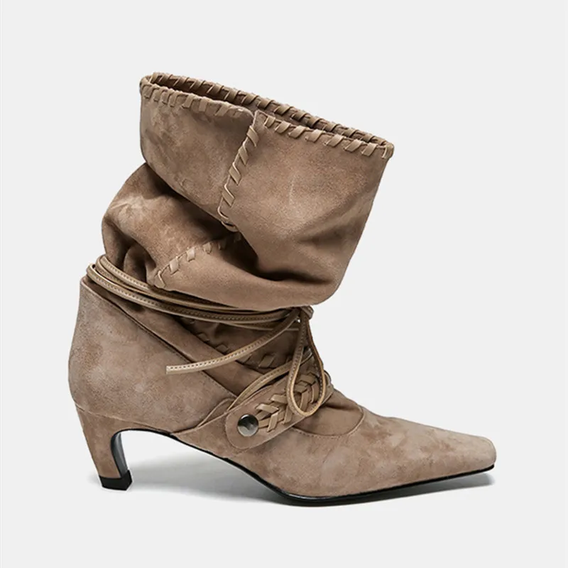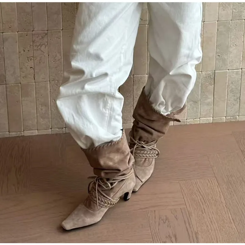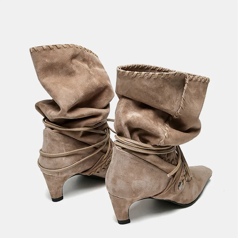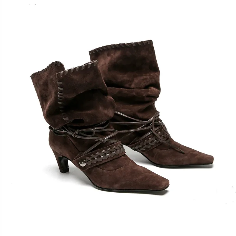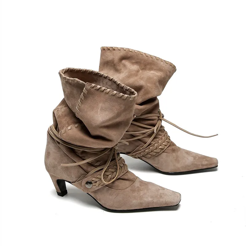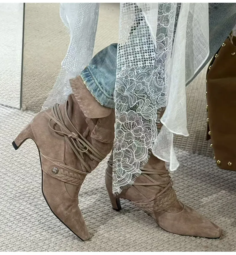 KYLETHOMASW - Autumn Winter Faux Suede Weave Lace-up Women Motorcycle Boots Fashion High heels Chelsea Western Mid-Calf Short Booties Shoes