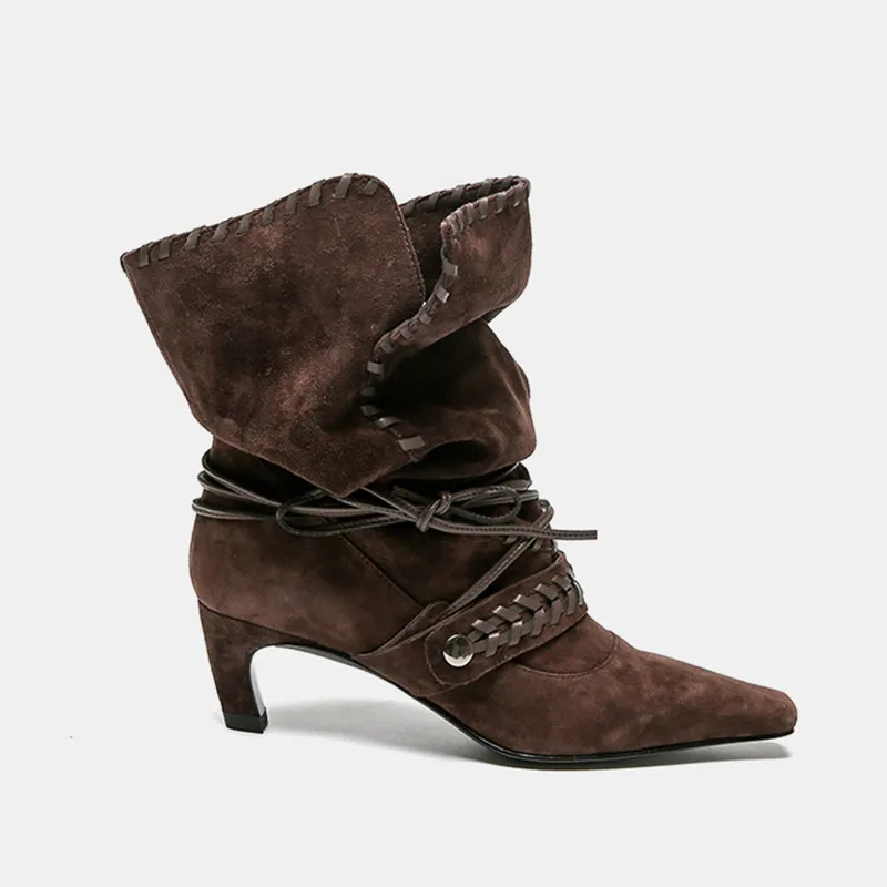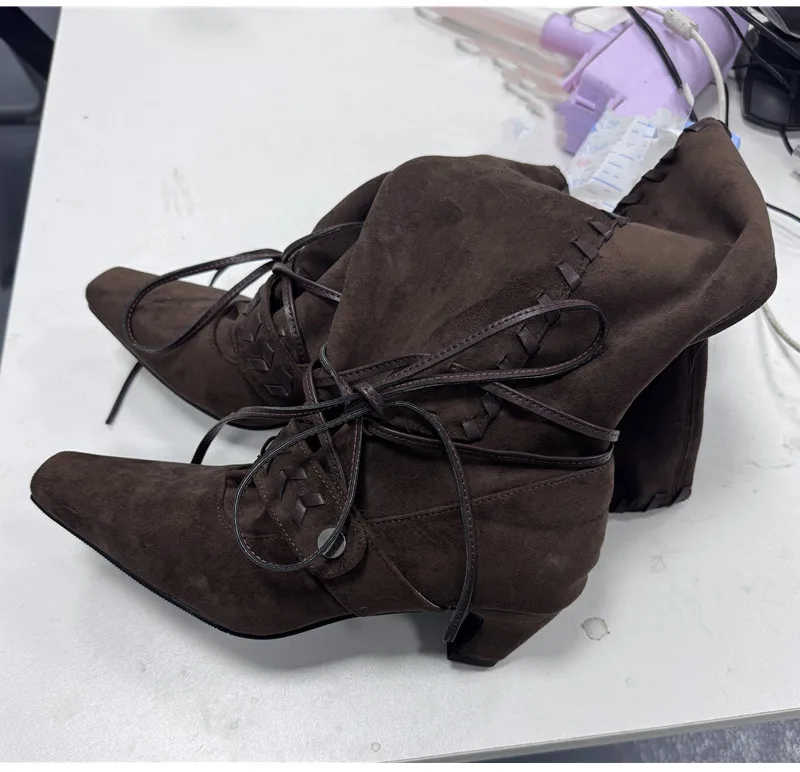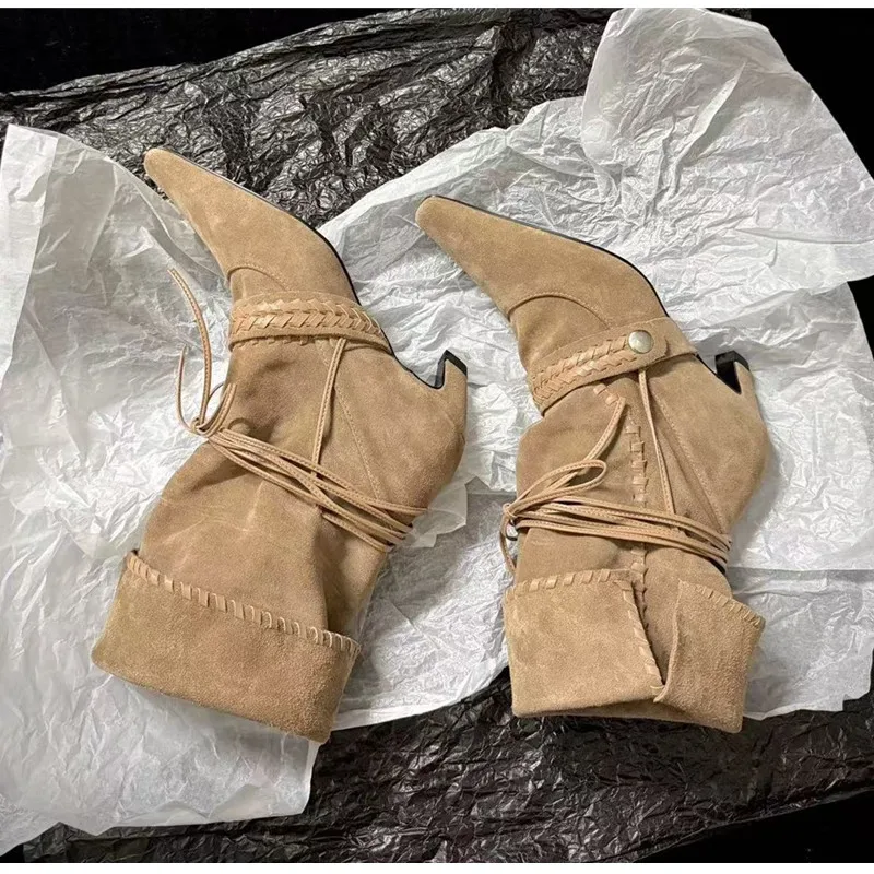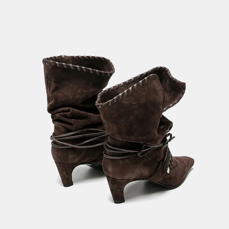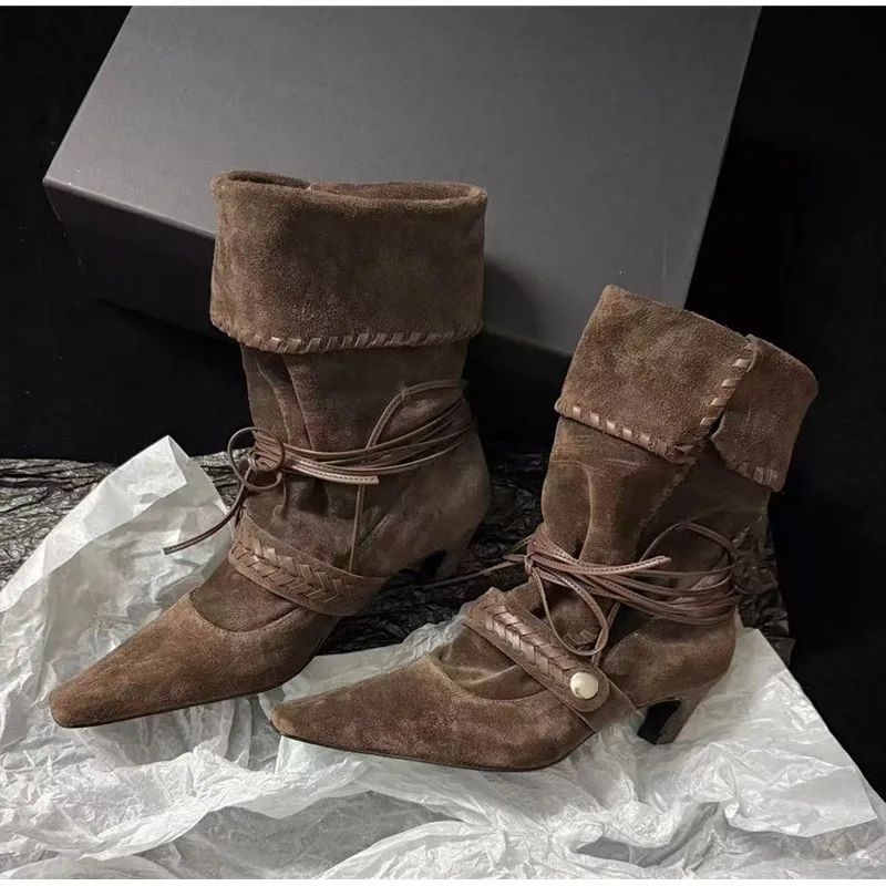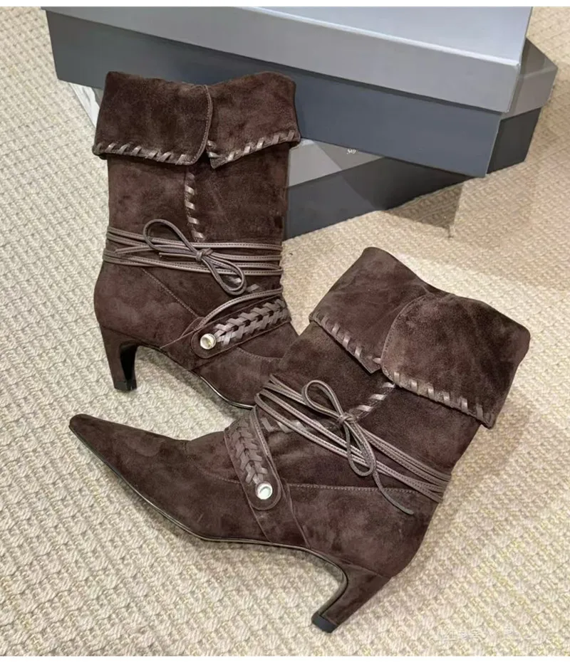KYLETHOMASW - Autumn Winter Faux Suede Weave Lace-up Women Motorcycle Boots Fashion High heels Chelsea Western Mid-Calf Short Booties Shoes