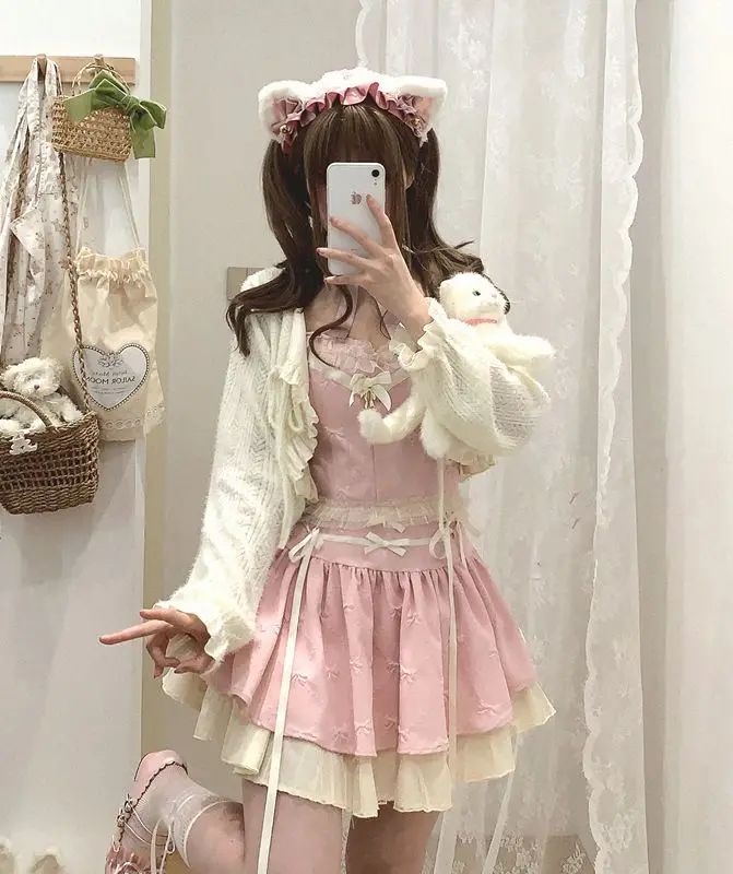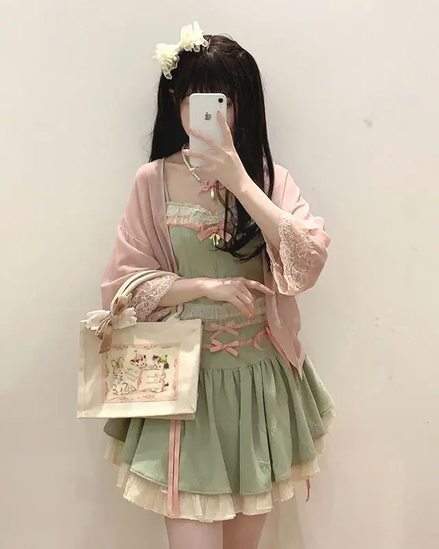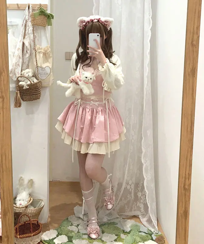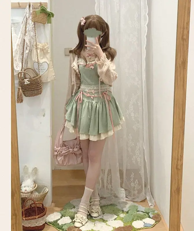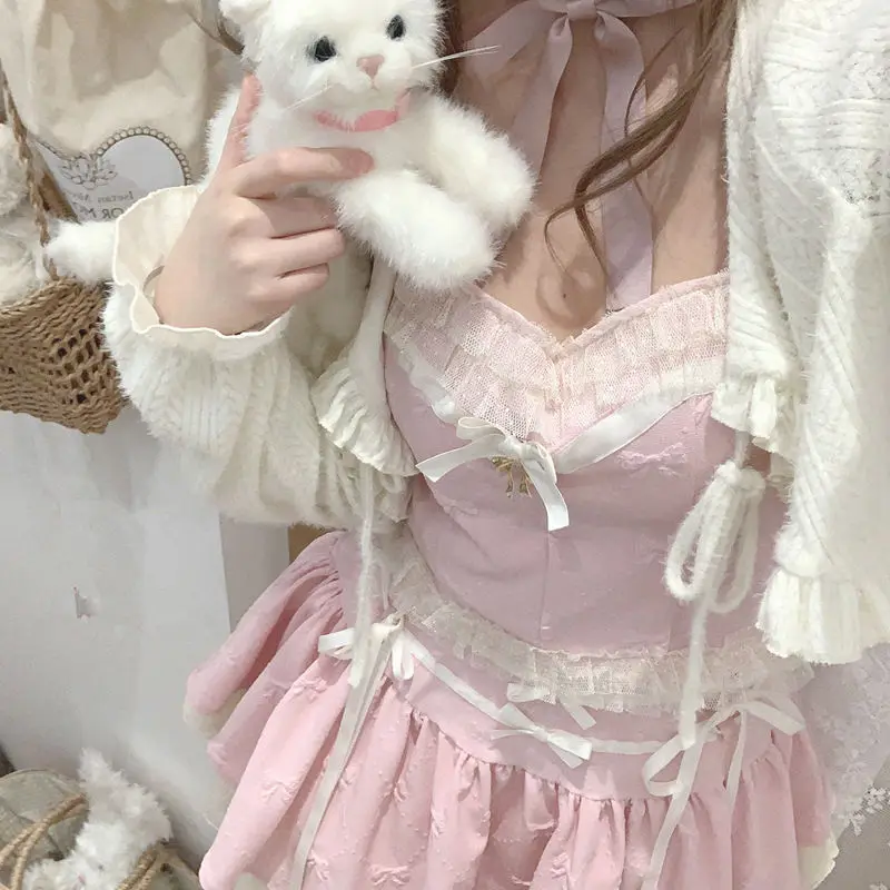 KYLETHOMASW  -  Ballet Bow Tie High Waist Skirt Female Slimming Sweet Lace Camisole Top Short Skirt Set