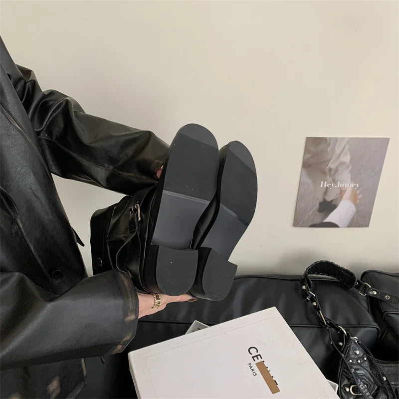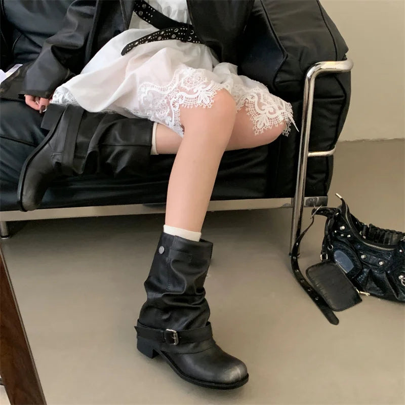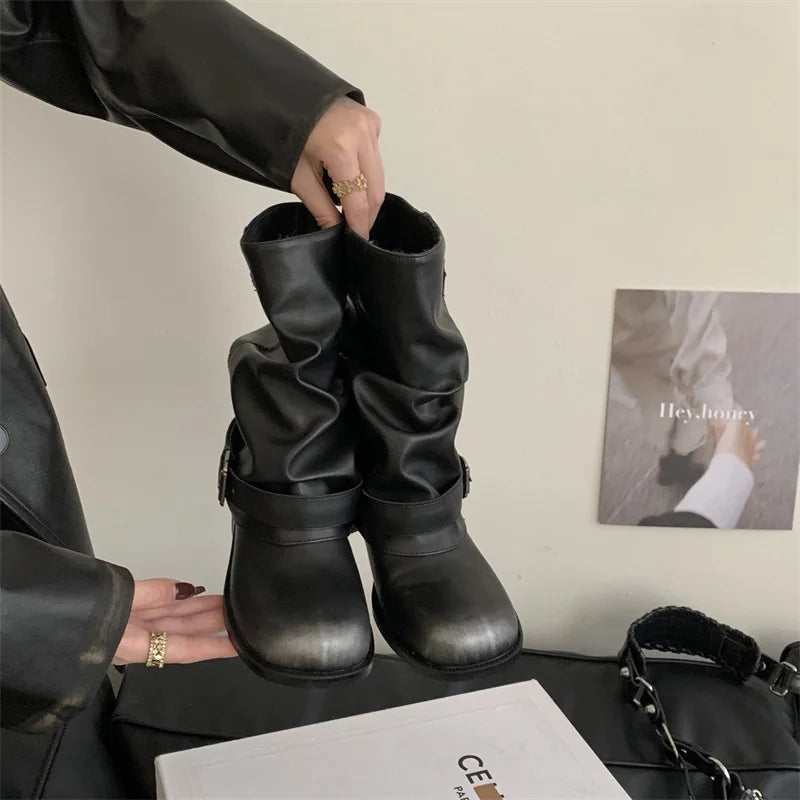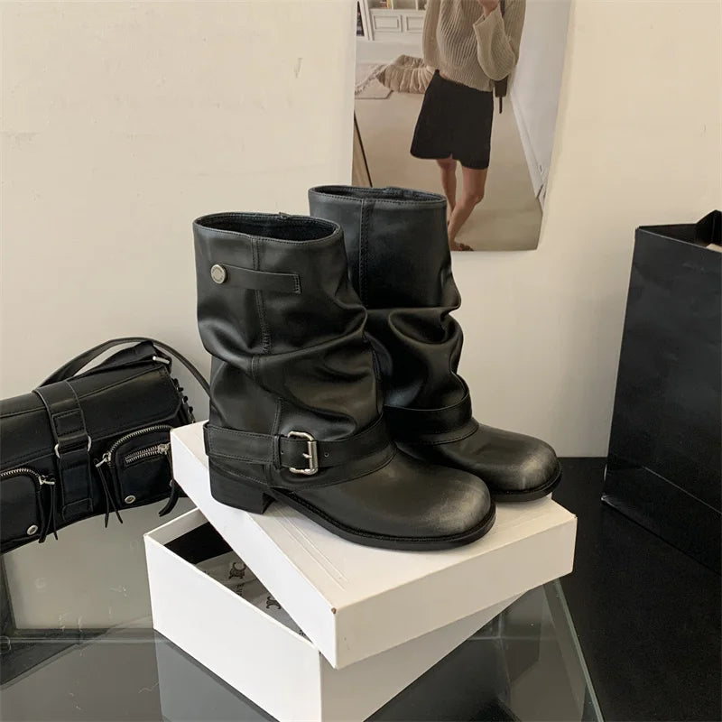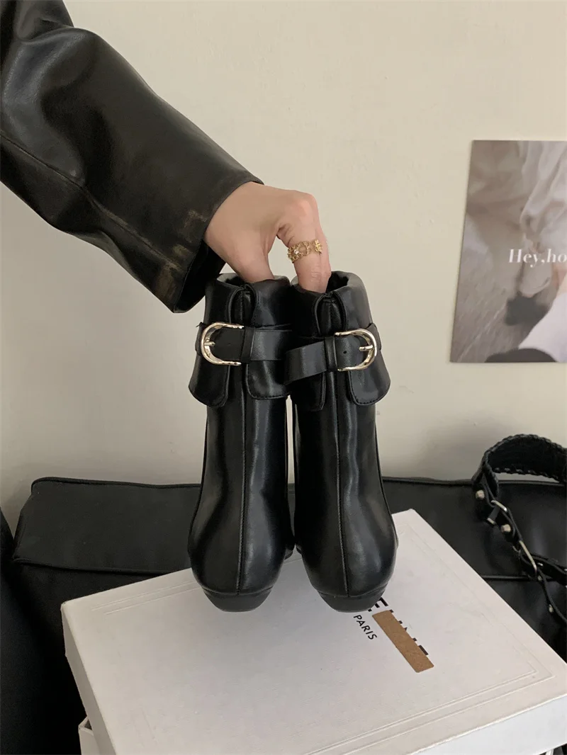 KYLETHOMASW - Black Boots Ladies Round Toe Chunky Heels Fall Shoes Belt Buckle Cowboy Boots For Woman 2025 New Arrivals Botas Vintage