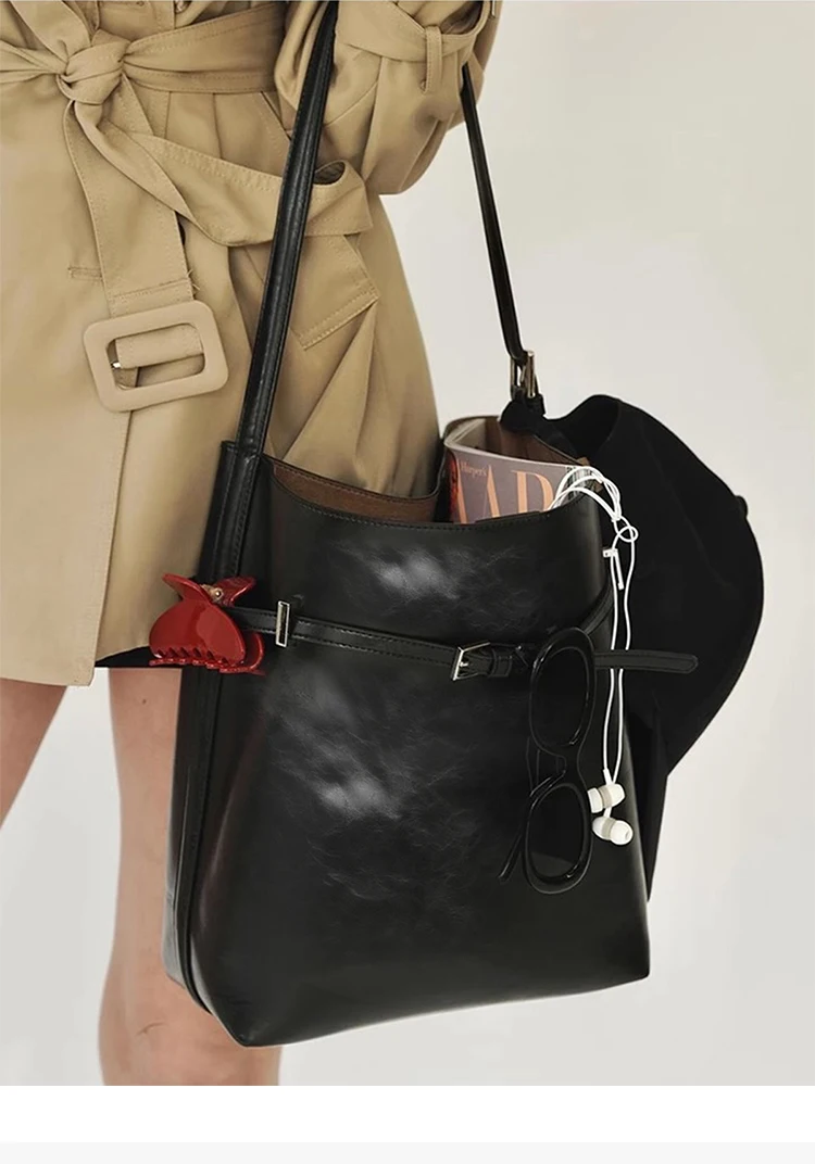 KYLETHOMASW  -  casual casual black large-capacity bucket bag ins oil wax leather shoulder bag versatile commuter bag