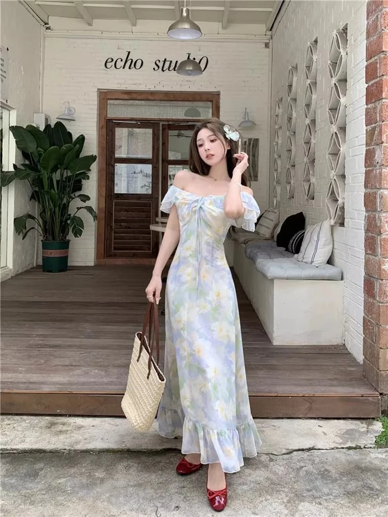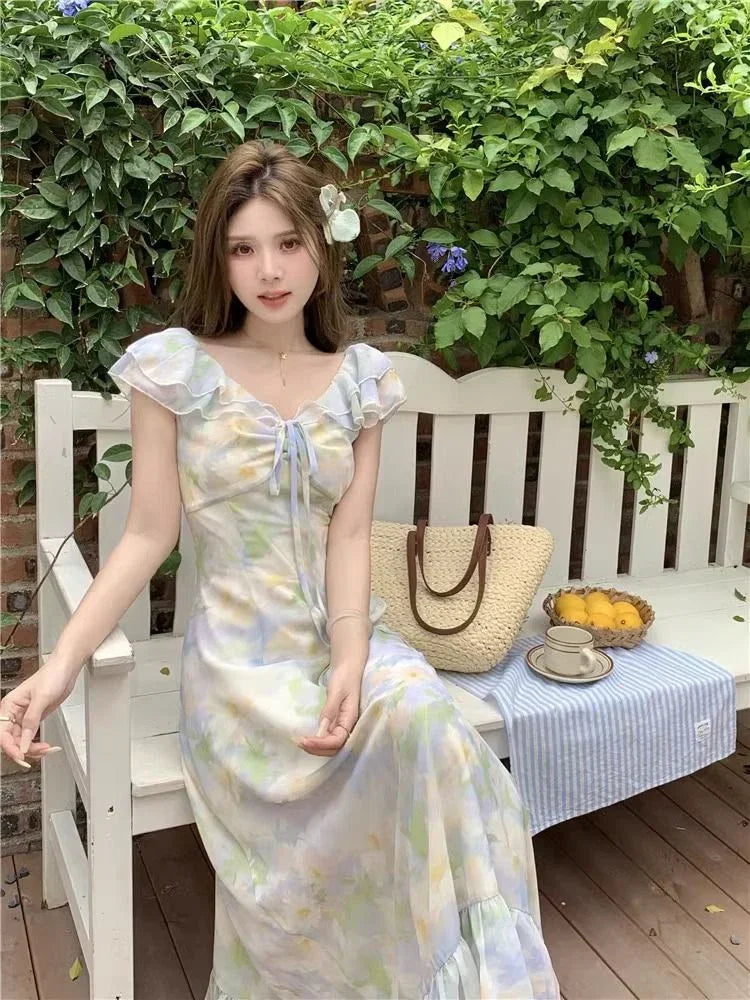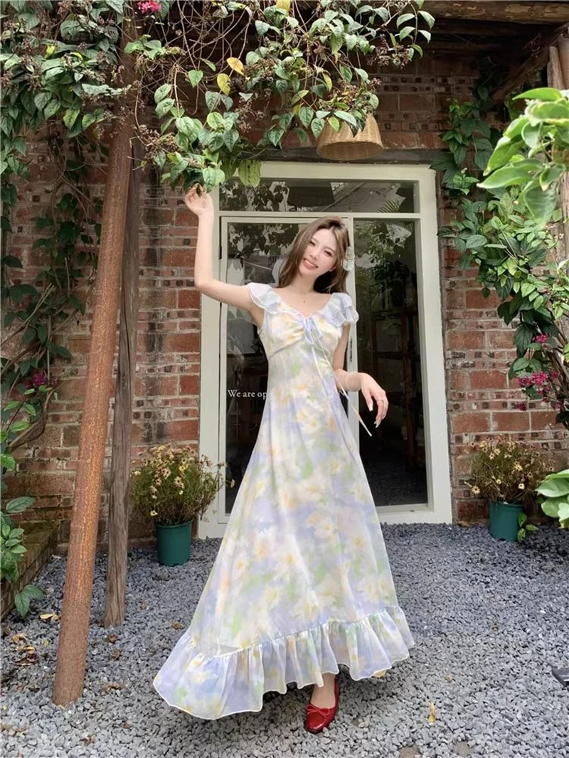 KYLETHOMASW - Chiffon Floral Ruffles Dress Women Elegant Flying Sleeve Dress Sweet Slim A Line V Neck Summer Lace Up Lady Vintage Vestidos