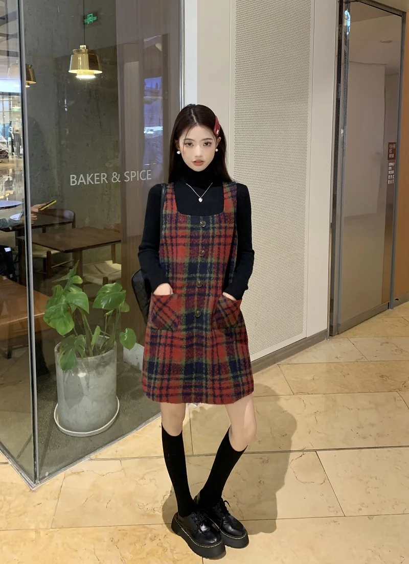KYLETHOMASW  -  Christmas Red Plaid Strap Dress Female Autumn Winter New Vintage Dresses Slimming Sweet Age Reduction Woolen Base Skirt