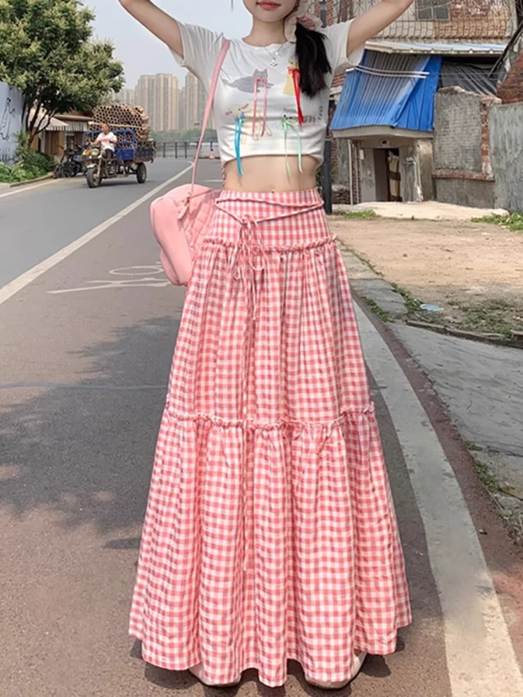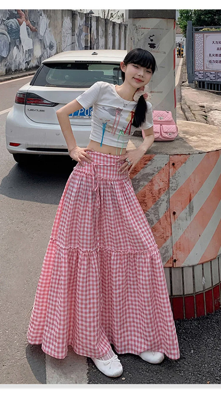 KYLETHOMASW - Color Blocking Plaid Design Women's Skirt 2024 Summer New Elastic Waist Long Skirt Korean Fashion Pastoral Style A-line Skirt