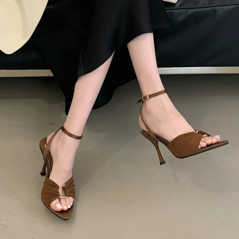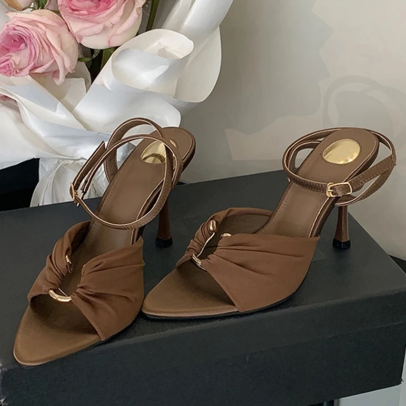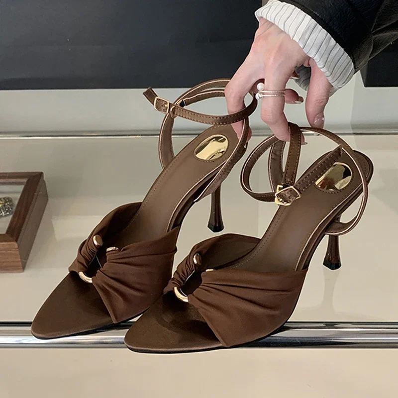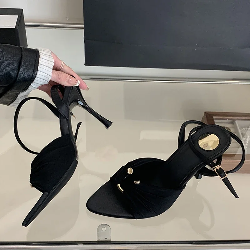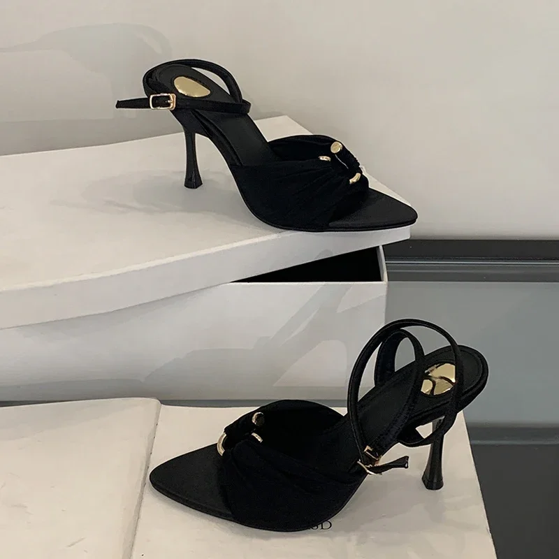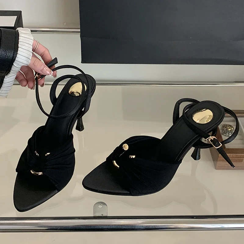 KYLETHOMASW  -  Comfort Hollow Out Metal Buckle Decoration Women Sandals Elegant Satin Ankle Strap Heels Pointed Toe Party Designer Women Shoes