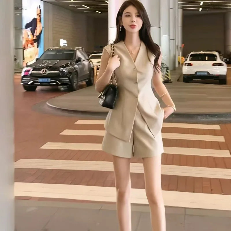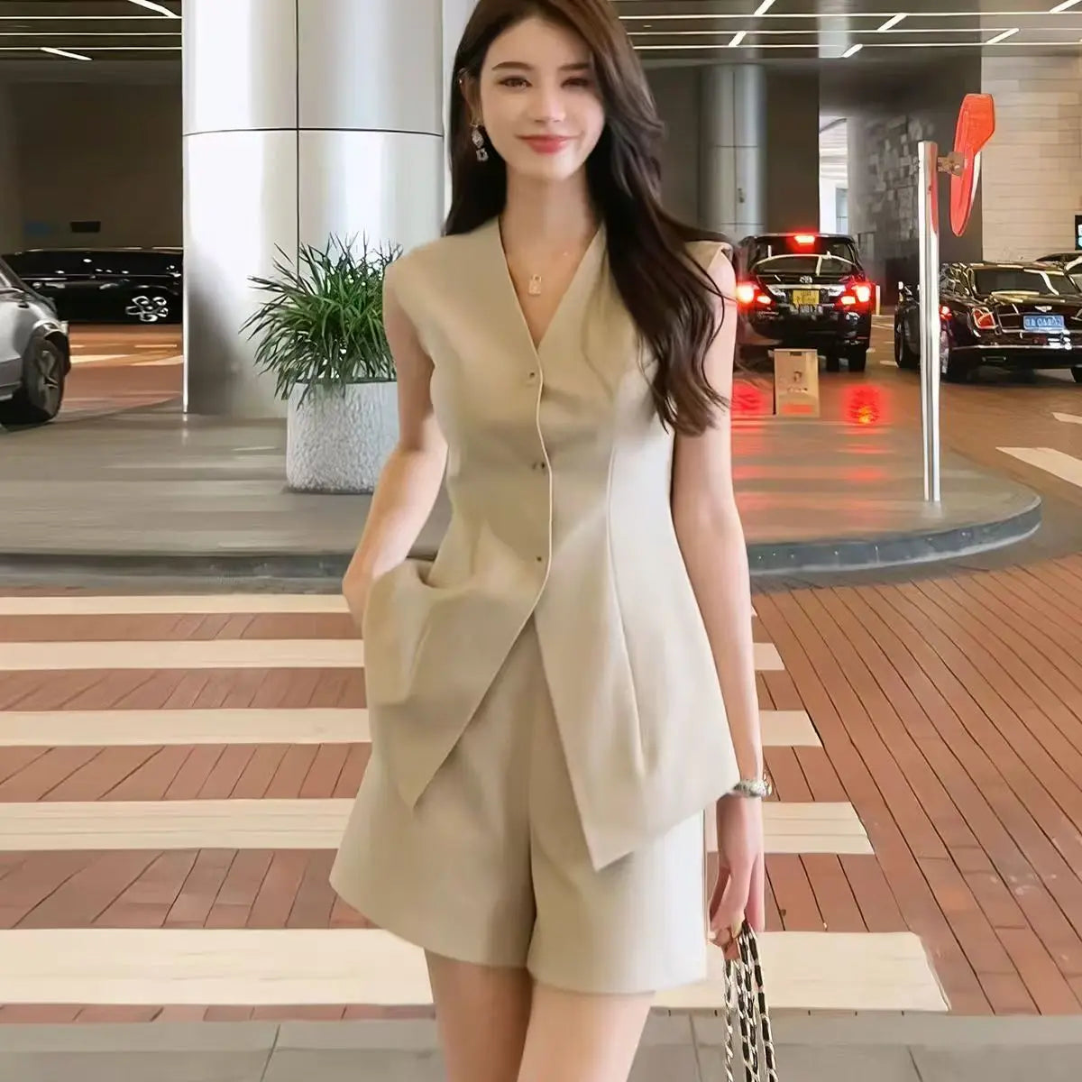 KYLETHOMASW - Commuter Suit Women's Summer V-neck Suit Vest High Waisted Wide Leg Shorts Two-piece Set Fashion Female Clothes