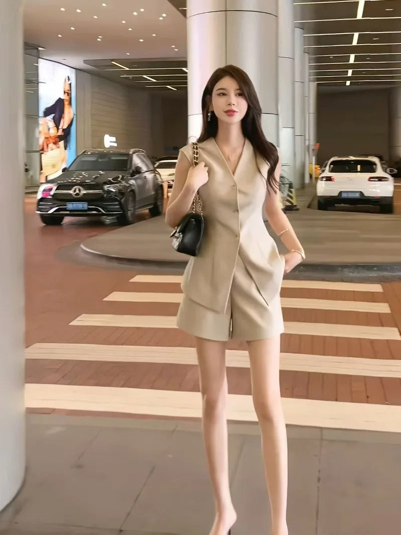 KYLETHOMASW  -  ​​Commuter Suit Women's Summer V-neck Suit Vest High Waisted Wide Leg Shorts Two-piece Set Fashion Female Clothes