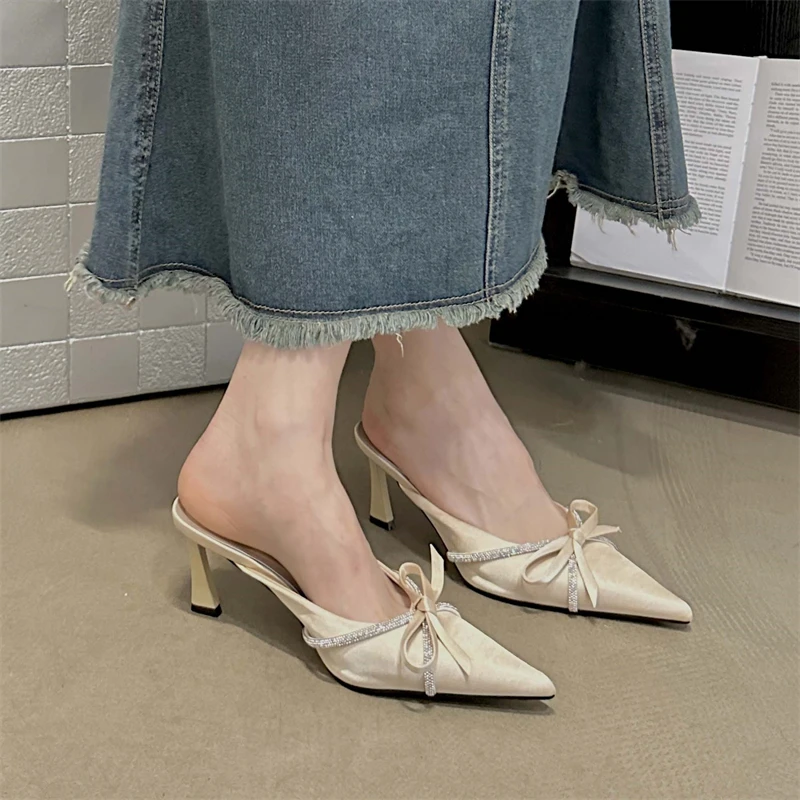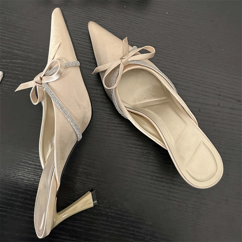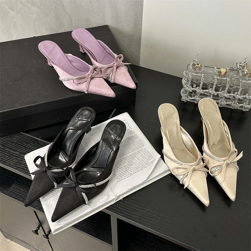 KYLETHOMASW - Crystal Butterfly-knot Woman Pumps Design Style Low Heels Ladies Pointed Toe Shallow Shoes Slides Mules Slippers