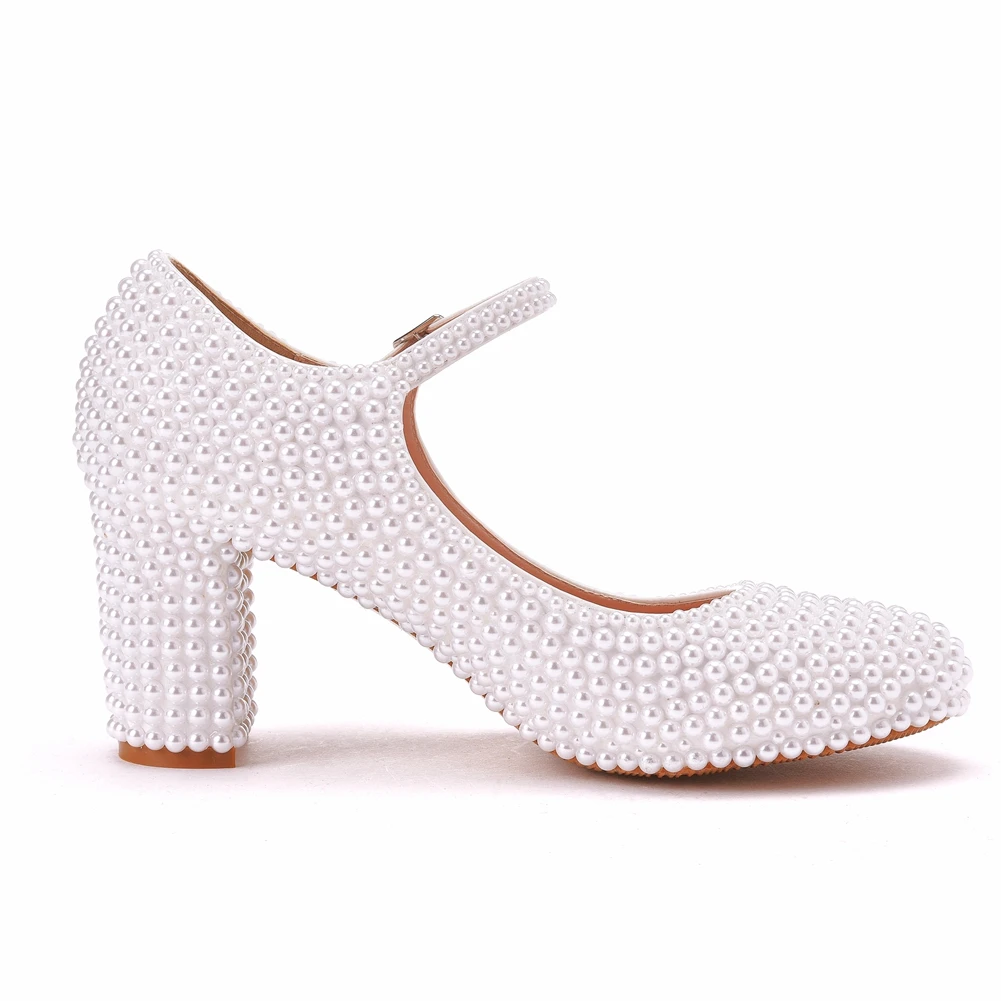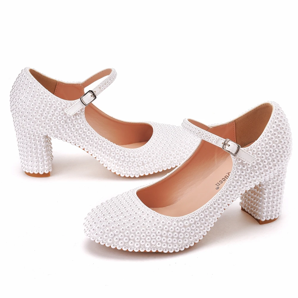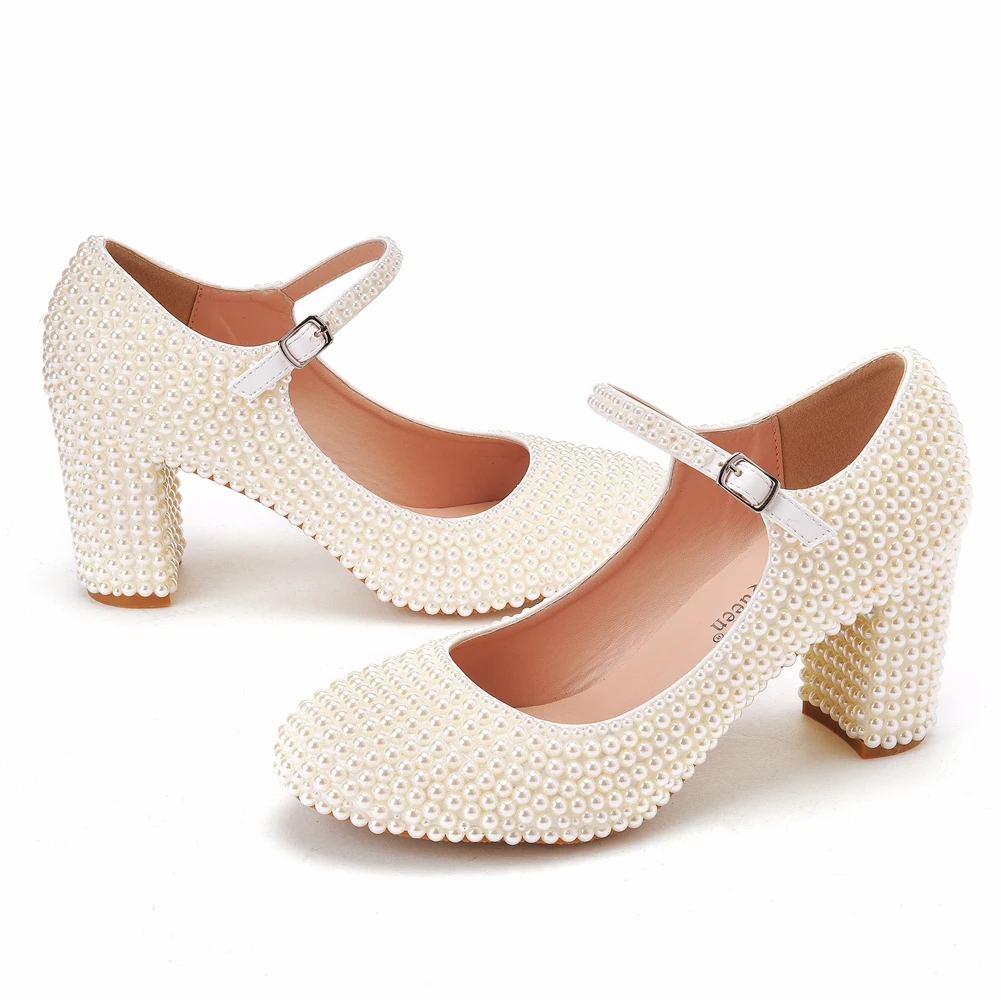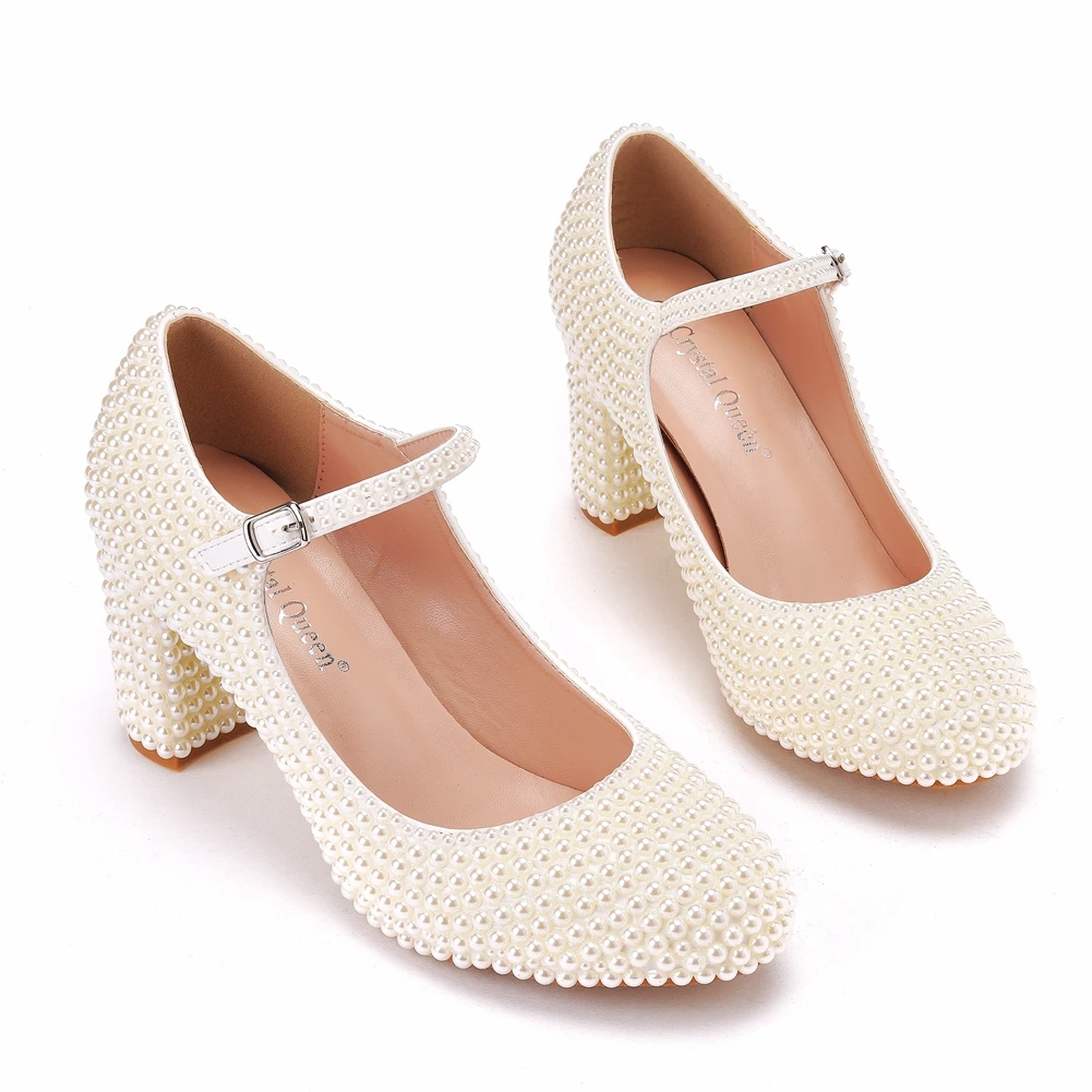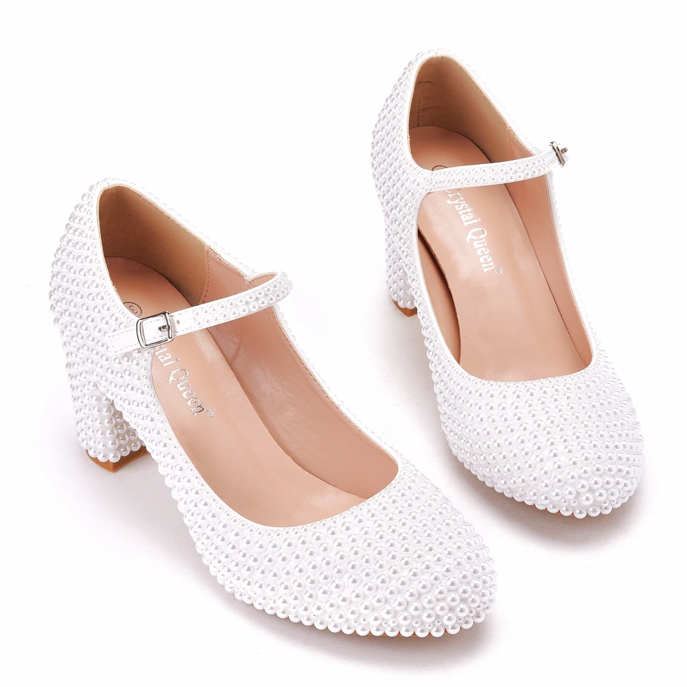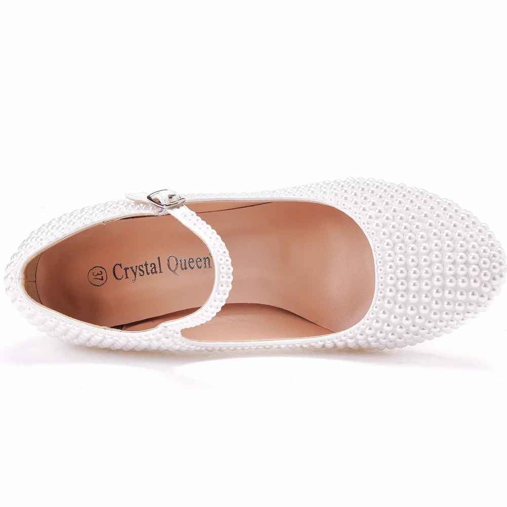 Kylethomasw Crystal Queen Platform High Heels Mary Janes White Lolita Women Style Vintage Pumps Party Beige Pearl Wedding Shoes 7CM
