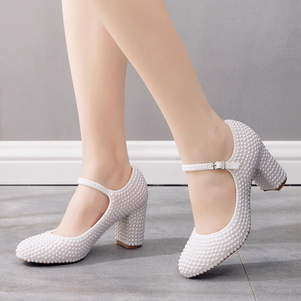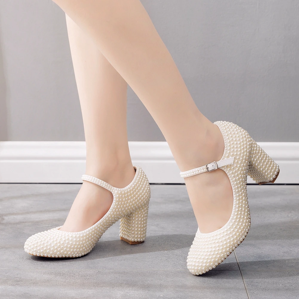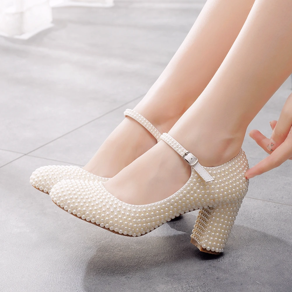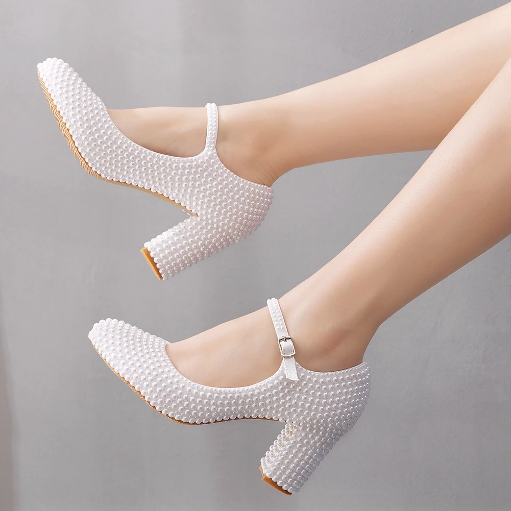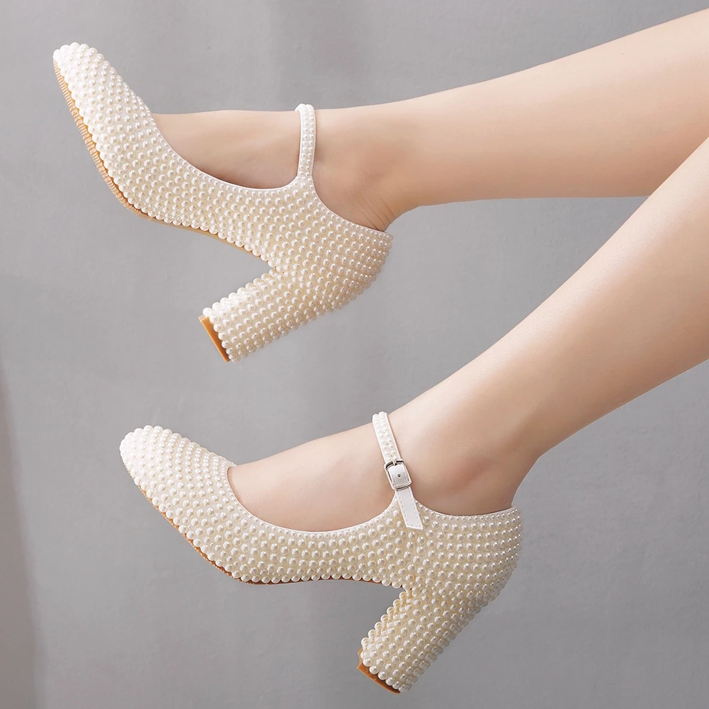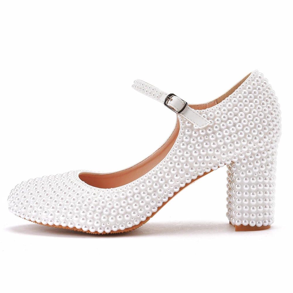 Kylethomasw Crystal Queen Platform High Heels Mary Janes White Lolita Women Style Vintage Pumps Party Beige Pearl Wedding Shoes 7CM