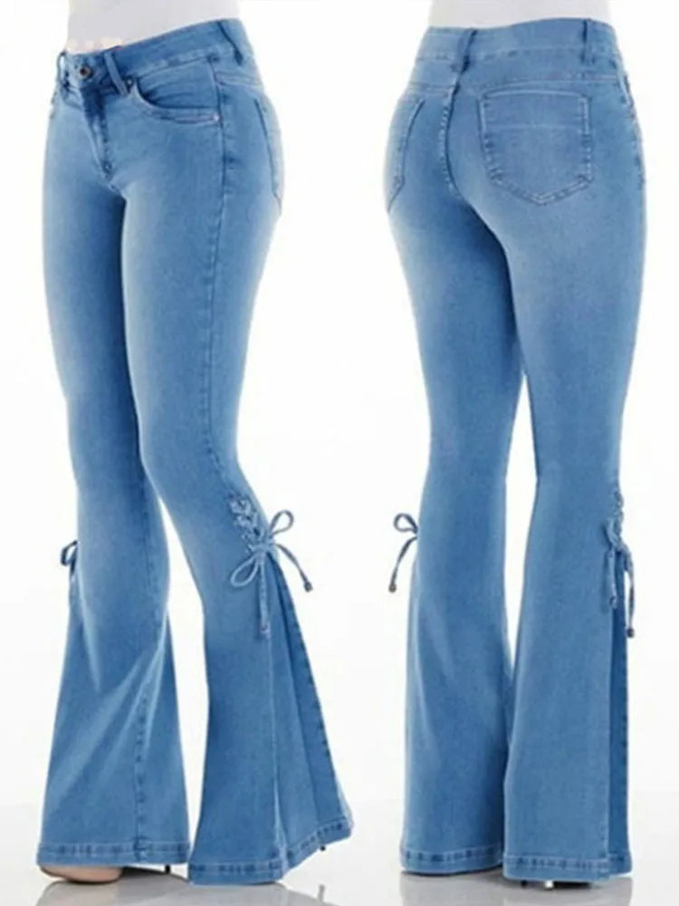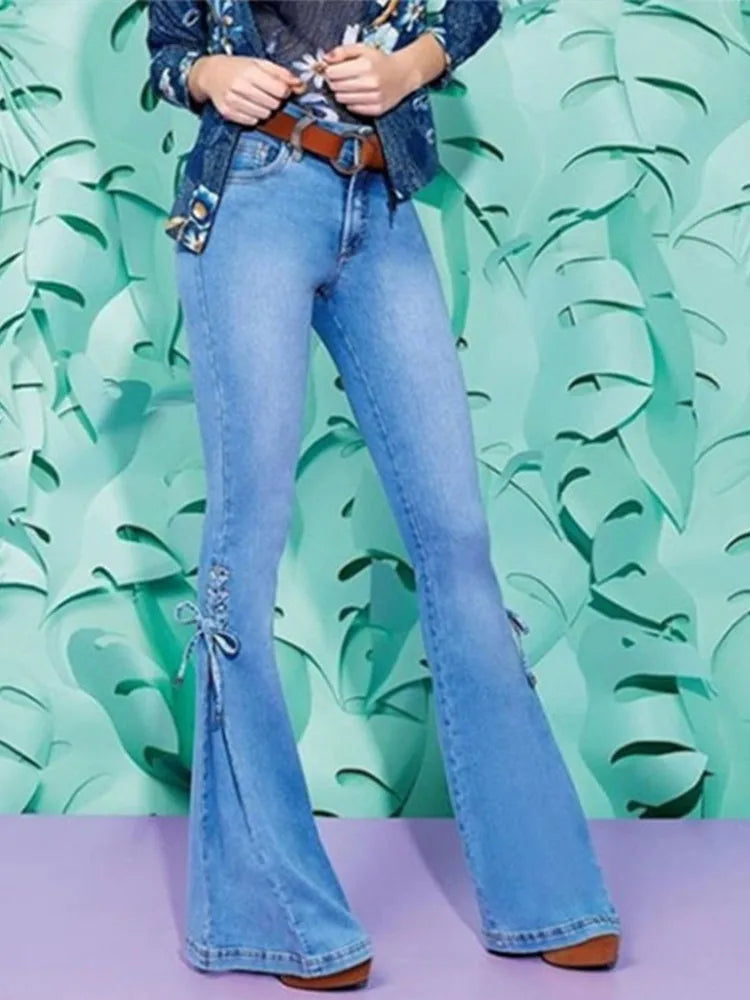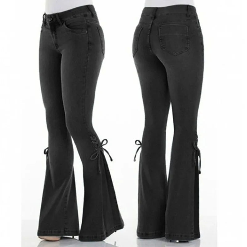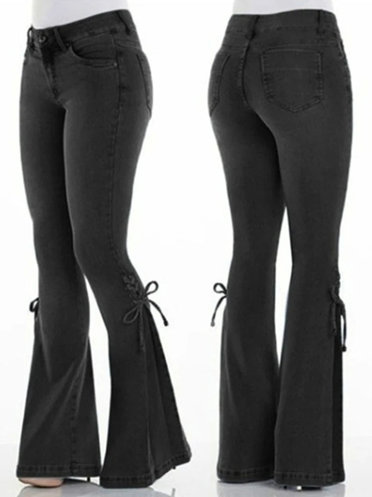 KYLETHOMASW  -  Designer Women's Flared Jeans Pants Bow Lace Up Y2k Jeans for Woman Pockets Pants Skin Tight Pant Streetwear Denim Trousers