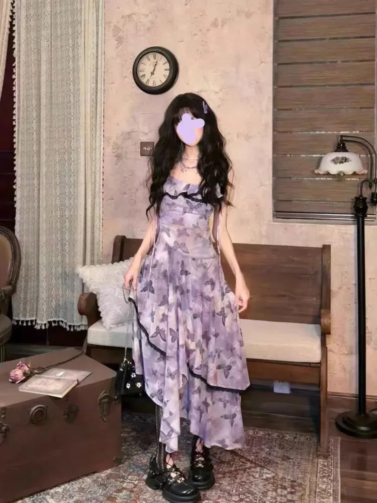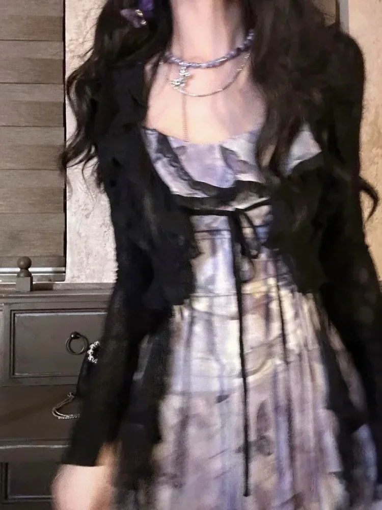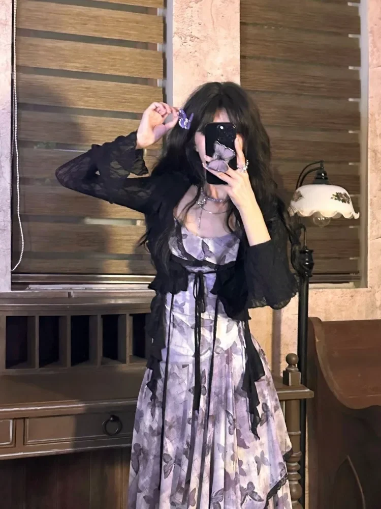 KYLETHOMASW - Elegant Vintage Butterfly Floral Irregular Mesh Camisole Dress+ Long Sleeve Lace Up Sun Protection Coat Two Piece Sets