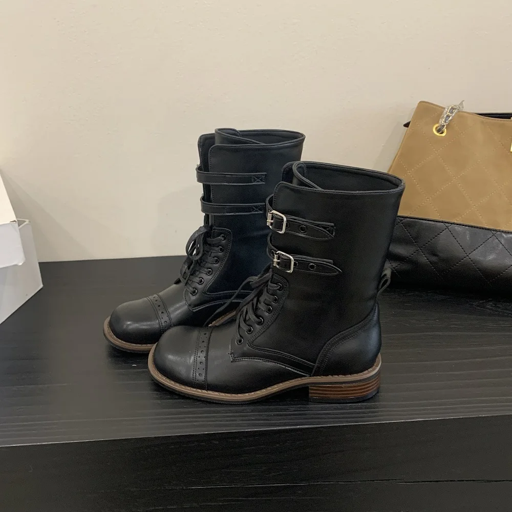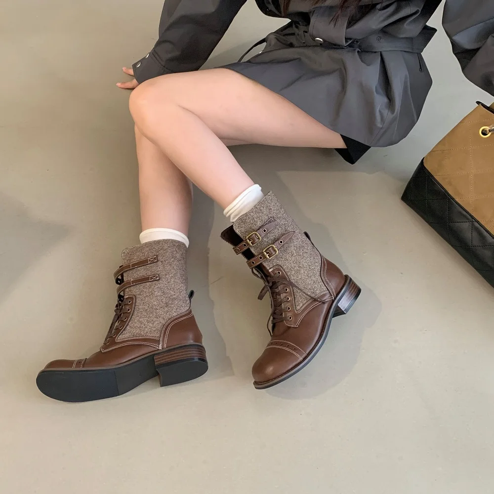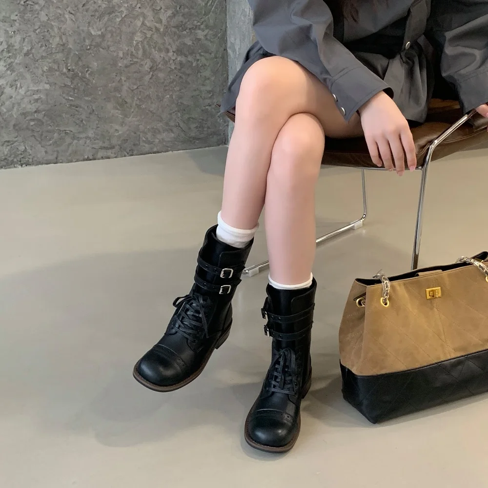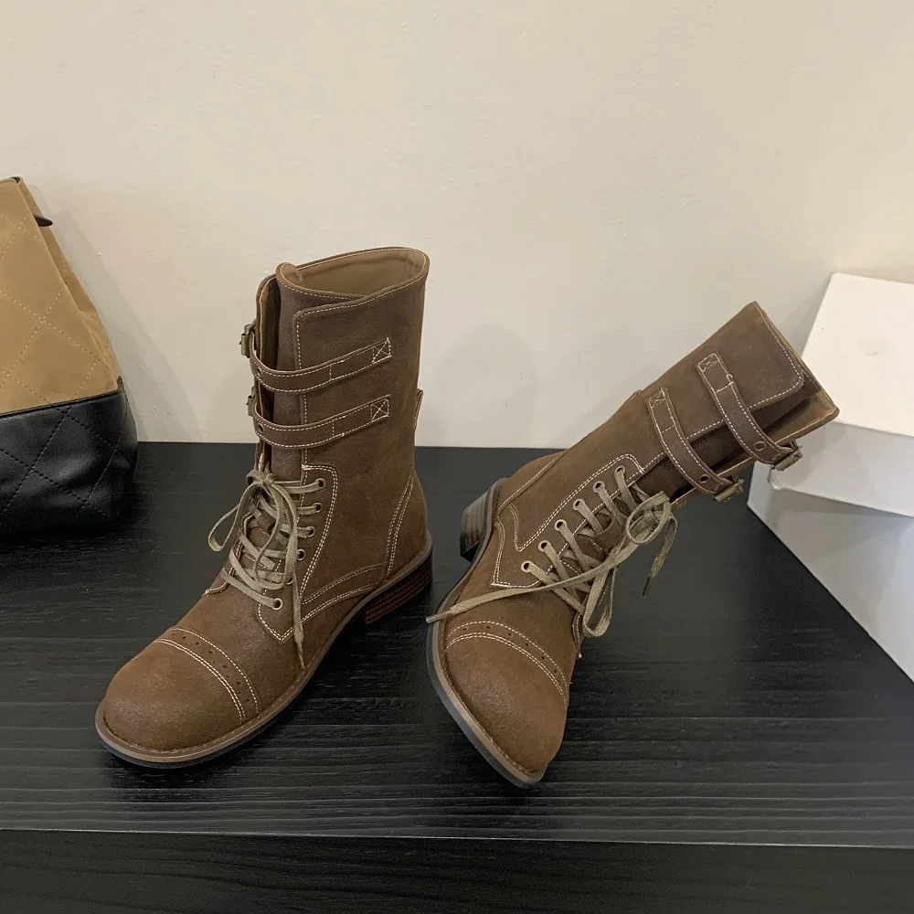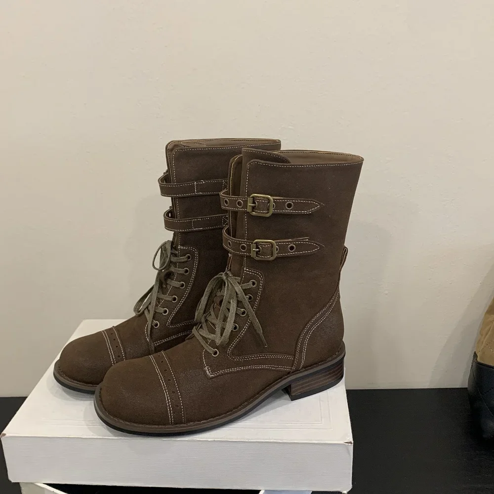 KYLETHOMASW - Fashion Design Narrow Band Lace-up Women Knee-High Boots Vintage Spring Autumn Round Toe Square Low Heels Shoes
