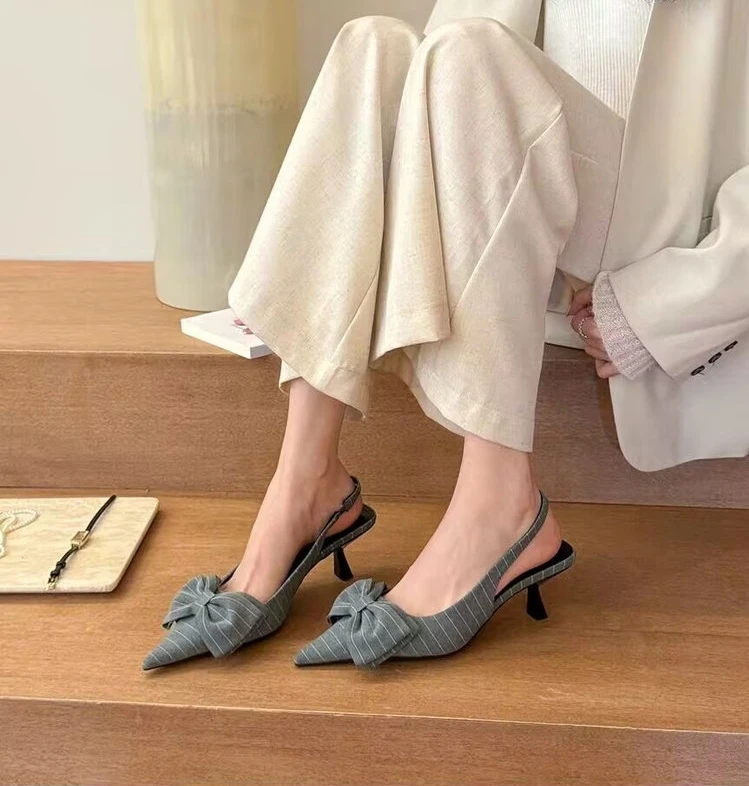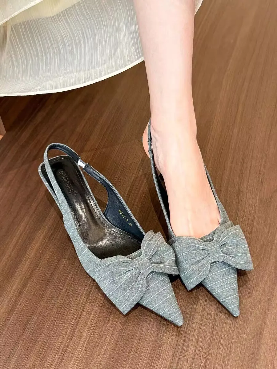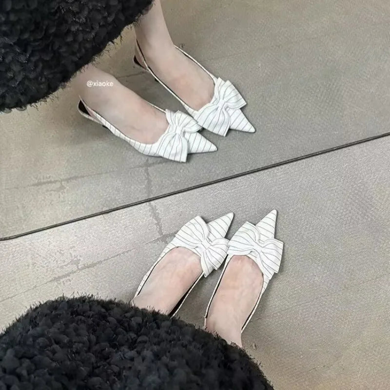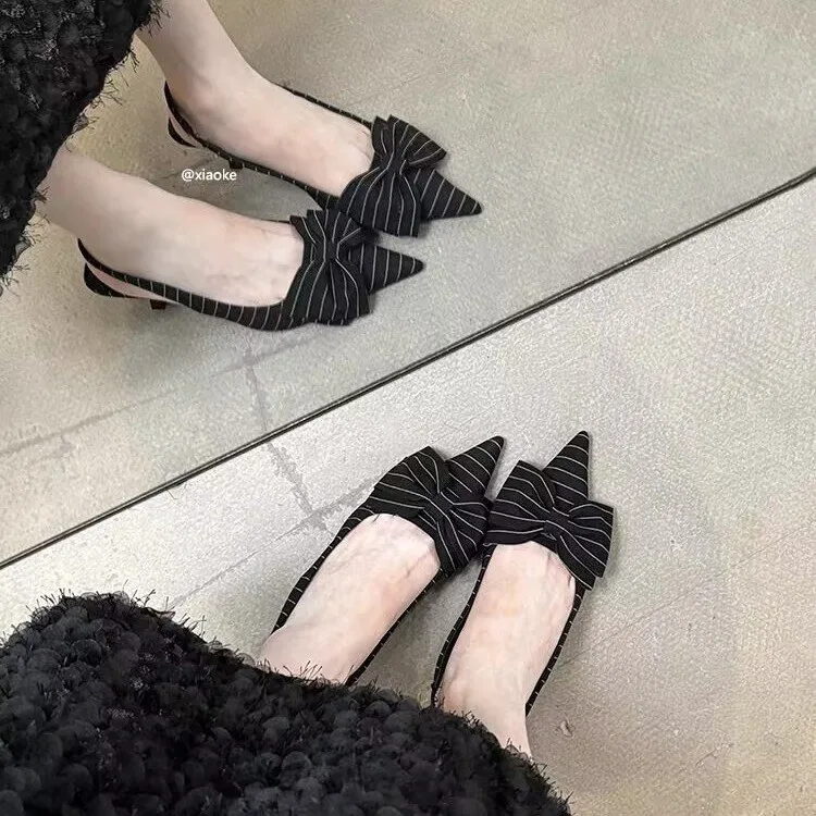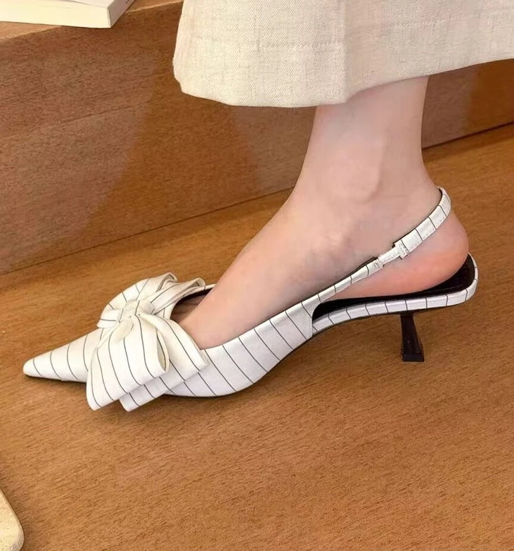 KYLETHOMASW - Fashion high heels women's striped design bow black temperament pointed stiletto sexy dress white bag sandals summer large size
