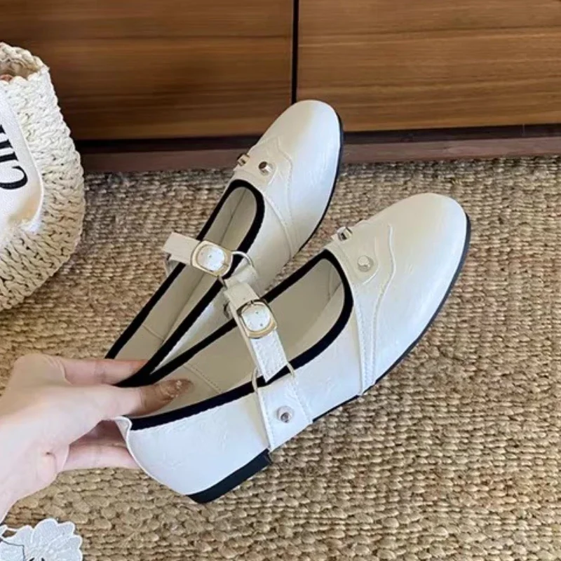 KYLETHOMASW - Fashion Rivet Decoration Mary Jane Shoes Retro Square Toe Comfort Soft Sole Ballet Flats Women Belt Buckle Shallow Designer Shoe